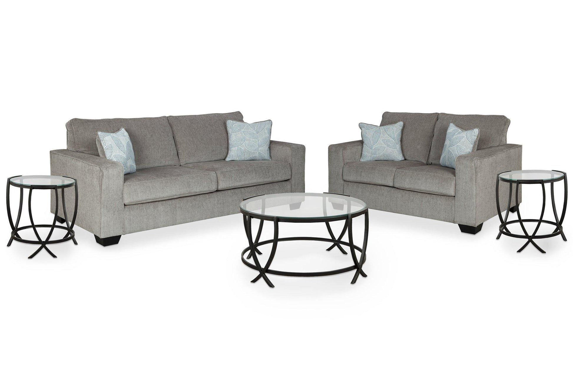 If style is the question, then this sofa and loveseat set is the answer. Sporting clean lines and sleek track arms, the decidedly contemporary profile is enhanced with plump cushioning and a chenille-feel upholstery, so pleasing to the touch. Sure to play well with so many color schemes, this sofa and loveseat set in slate gray includes understated floral pattern pillows for fashionably fresh appeal.More About This Product