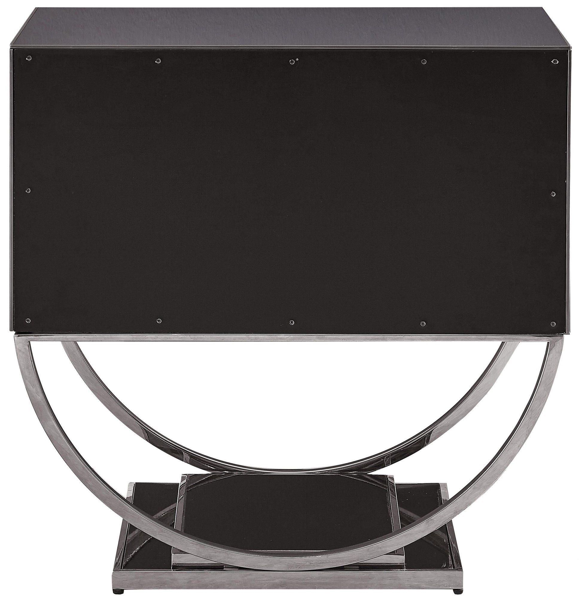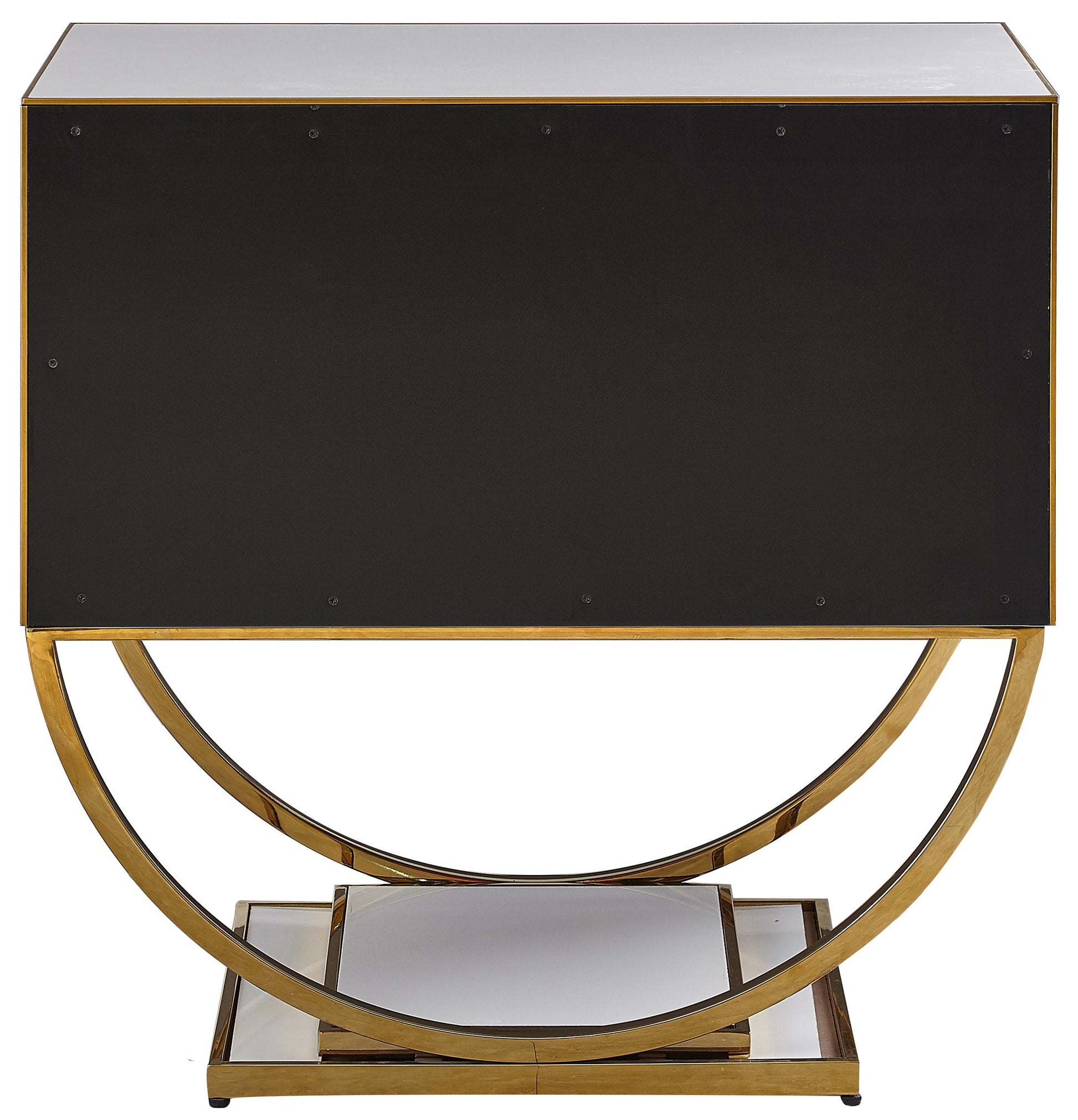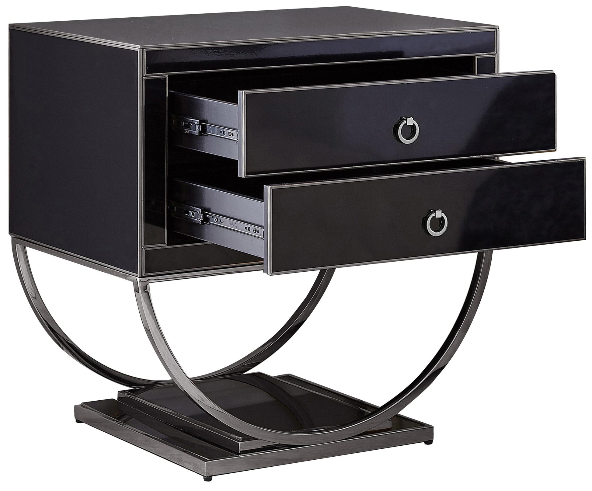 Top off your modern living room with the Alyssa Side Table from Meridian Furniture. This handsome table features a semi-circle base on a dual pedestal for an attention-commanding look. The black glass finish is trimmed in gold for a contrast that's nothing short of stunning. The double drawers help you organize everything from TV remotes to games and DVDs.