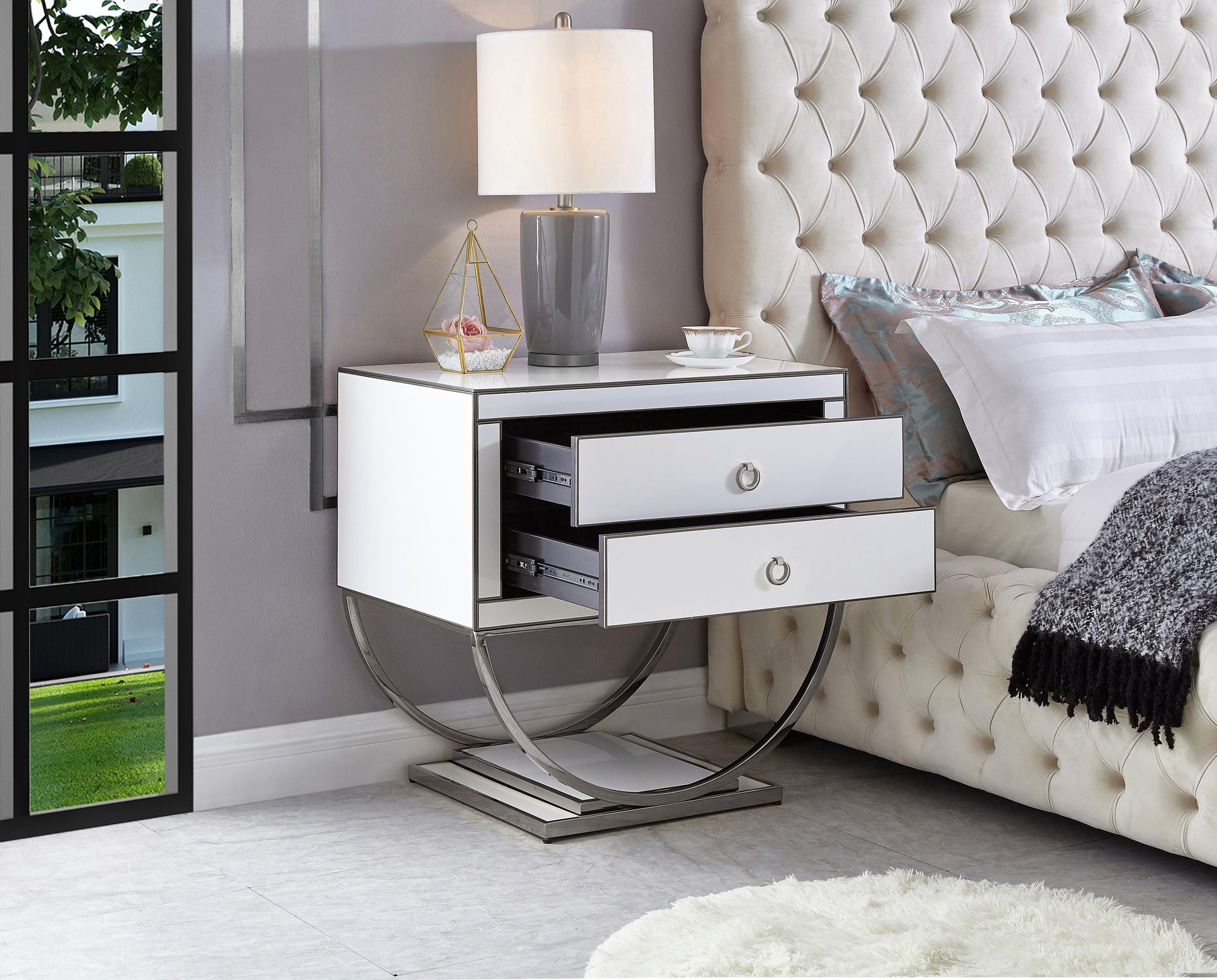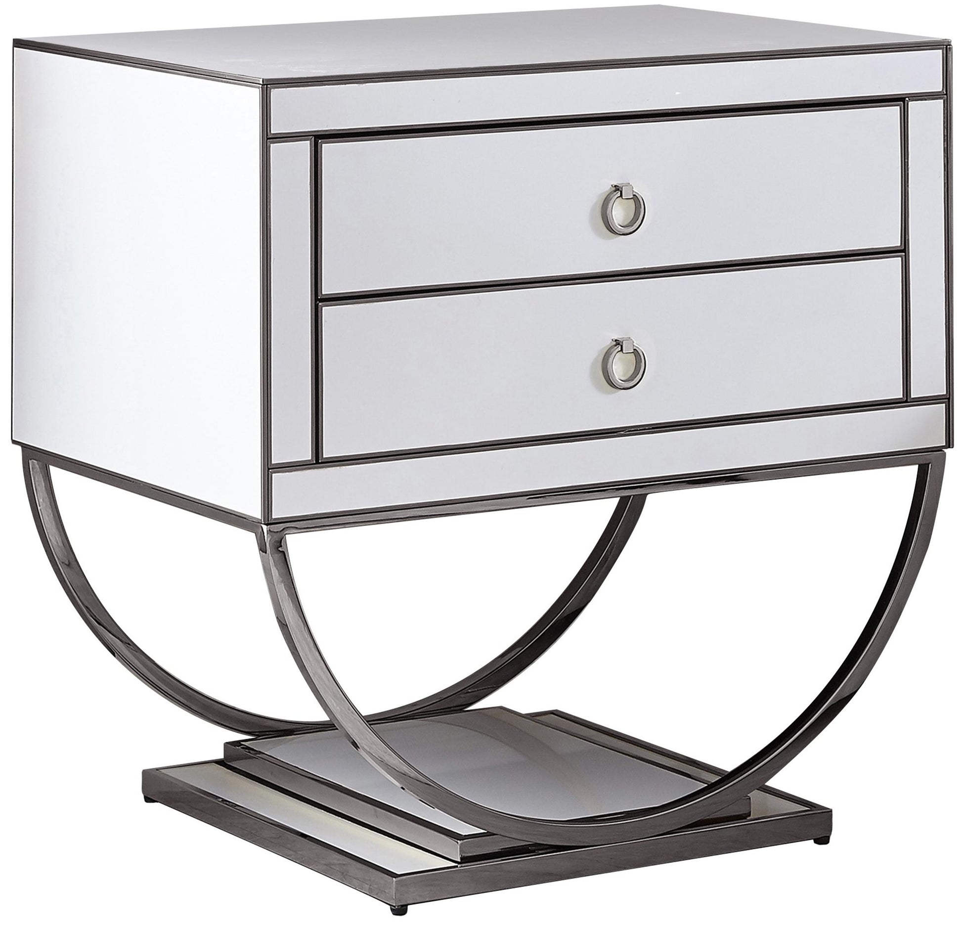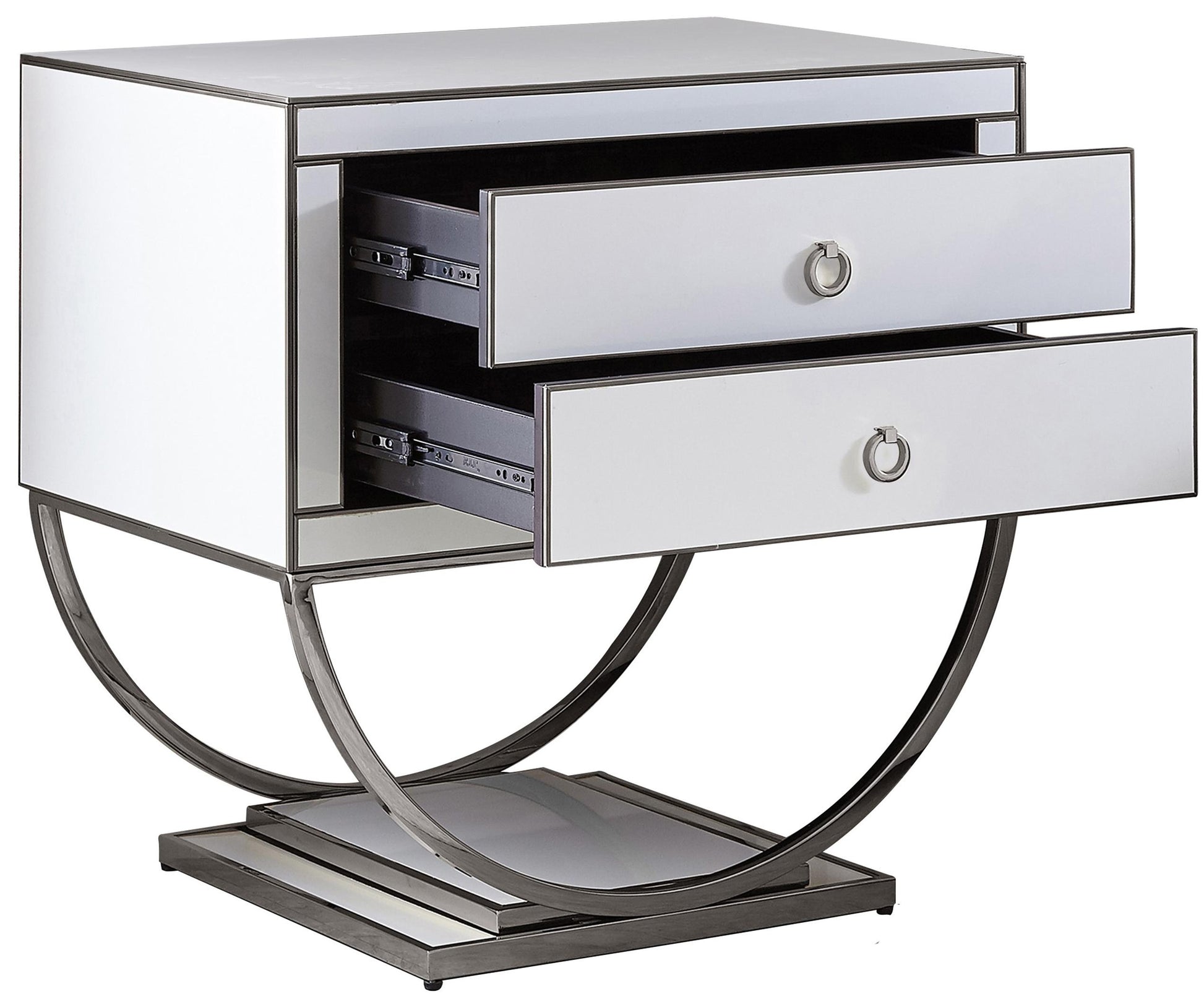 Top off your modern living room with the Alyssa Side Table from Meridian Furniture. This handsome table features a semi-circle base on a dual pedestal for an attention-commanding look. The black glass finish is trimmed in gold for a contrast that's nothing short of stunning. The double drawers help you organize everything from TV remotes to games and DVDs.