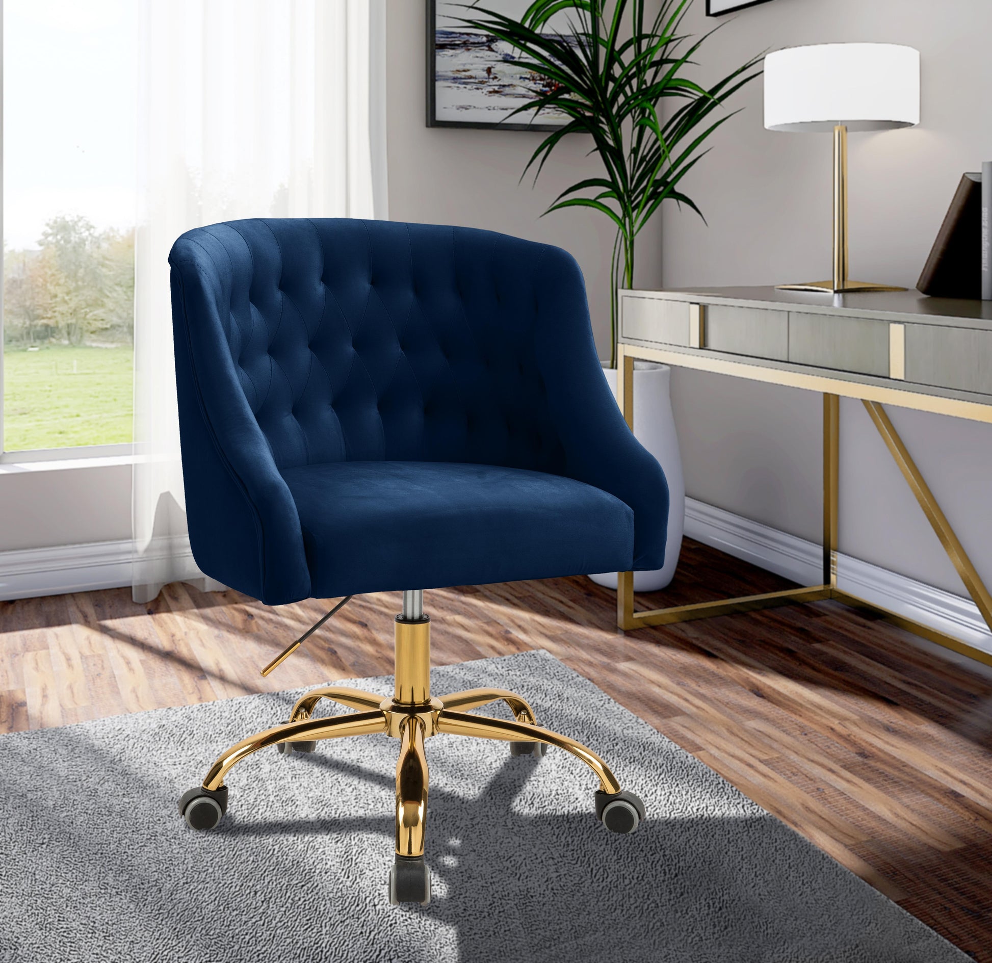 Stay cozy and comfortable at work while expressing your definitive modish tastes with this Arden Velvet Office Chair. This sumptuously appointed chair features soft navy velvet upholstery with svelte button tufting and a rich gold base, ensuring that it garners more than its fair share of oohs and aahs, no matter who���s admiring it. This contemporary office chair swivels to allow for expanded functionality, and it���s adjustable, so you can customize the chair���s position to meet your sitting preferences.