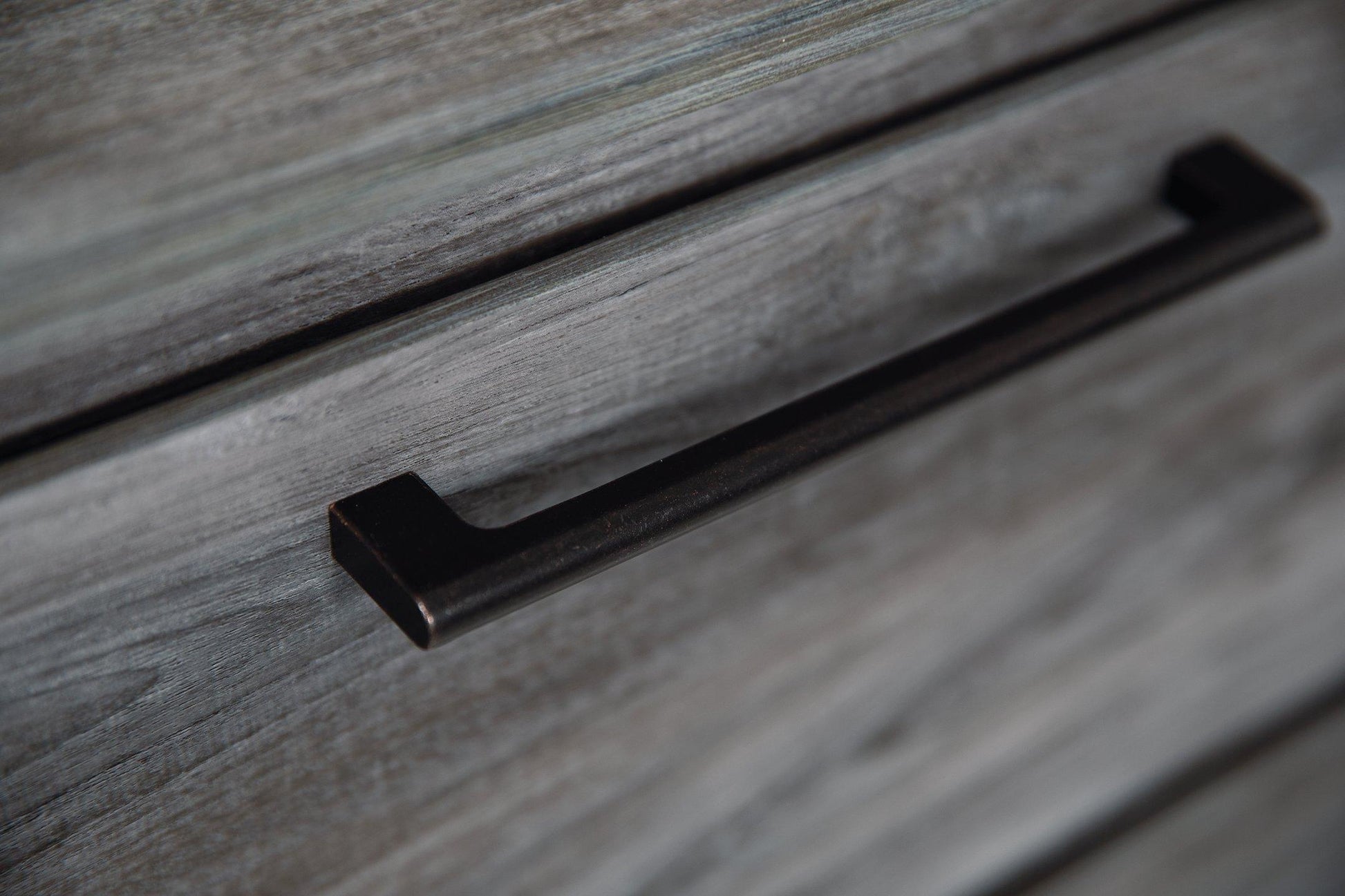 - Linear pulls with antiqued gunmetal-tone finish