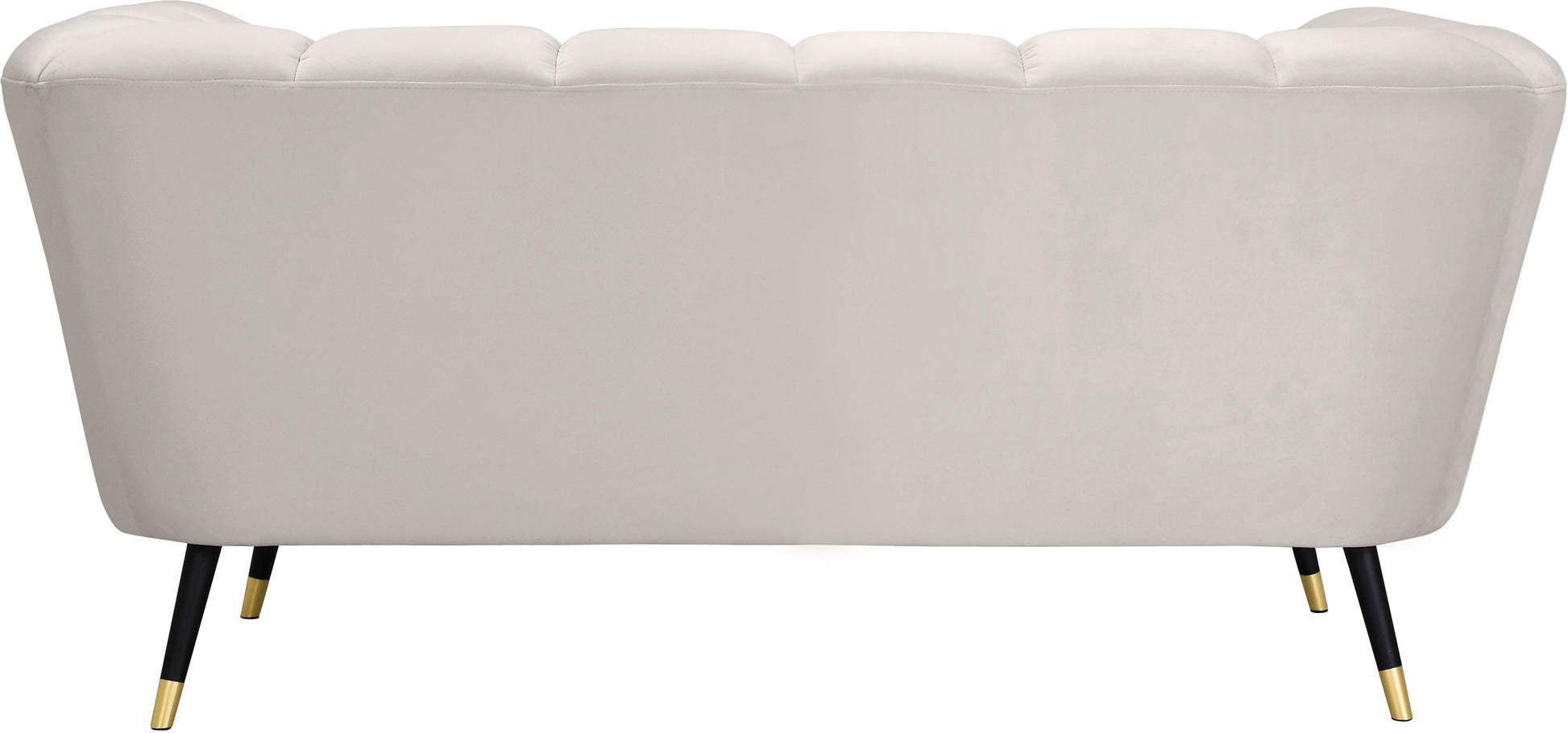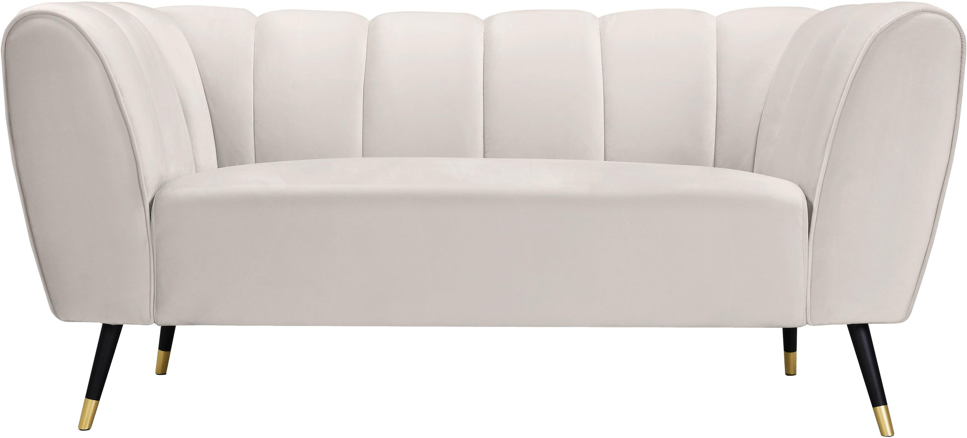 Sink your body into the inviting comfort of this Beaumont velvet love seat. Upholstered in a soft shade of cream with black metal legs tipped in gold, this chair oozes modern charm and up-to-the-minute comfort. The heavily stuffed arms, seat and back are bound to beckon at day���s end for you to sit and relax. Deep channel tufting on the back and arms adds to its uber welcoming look. Pair it with the matching pieces in the same collection for cohesive beauty.
