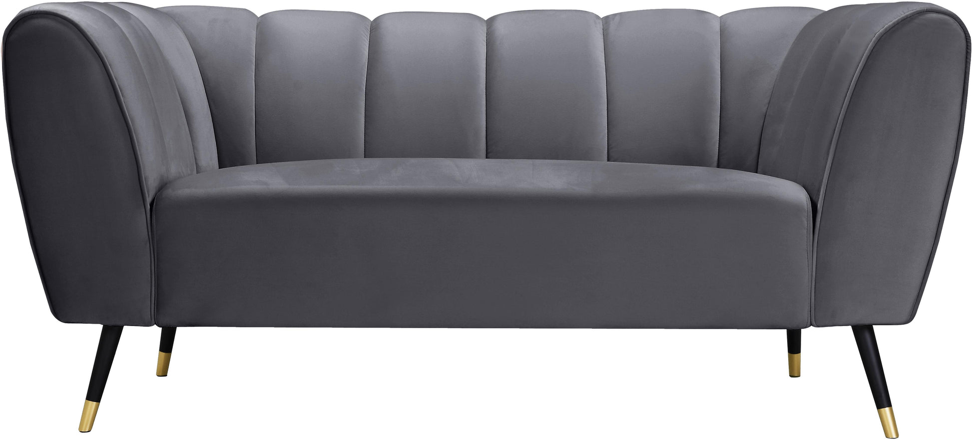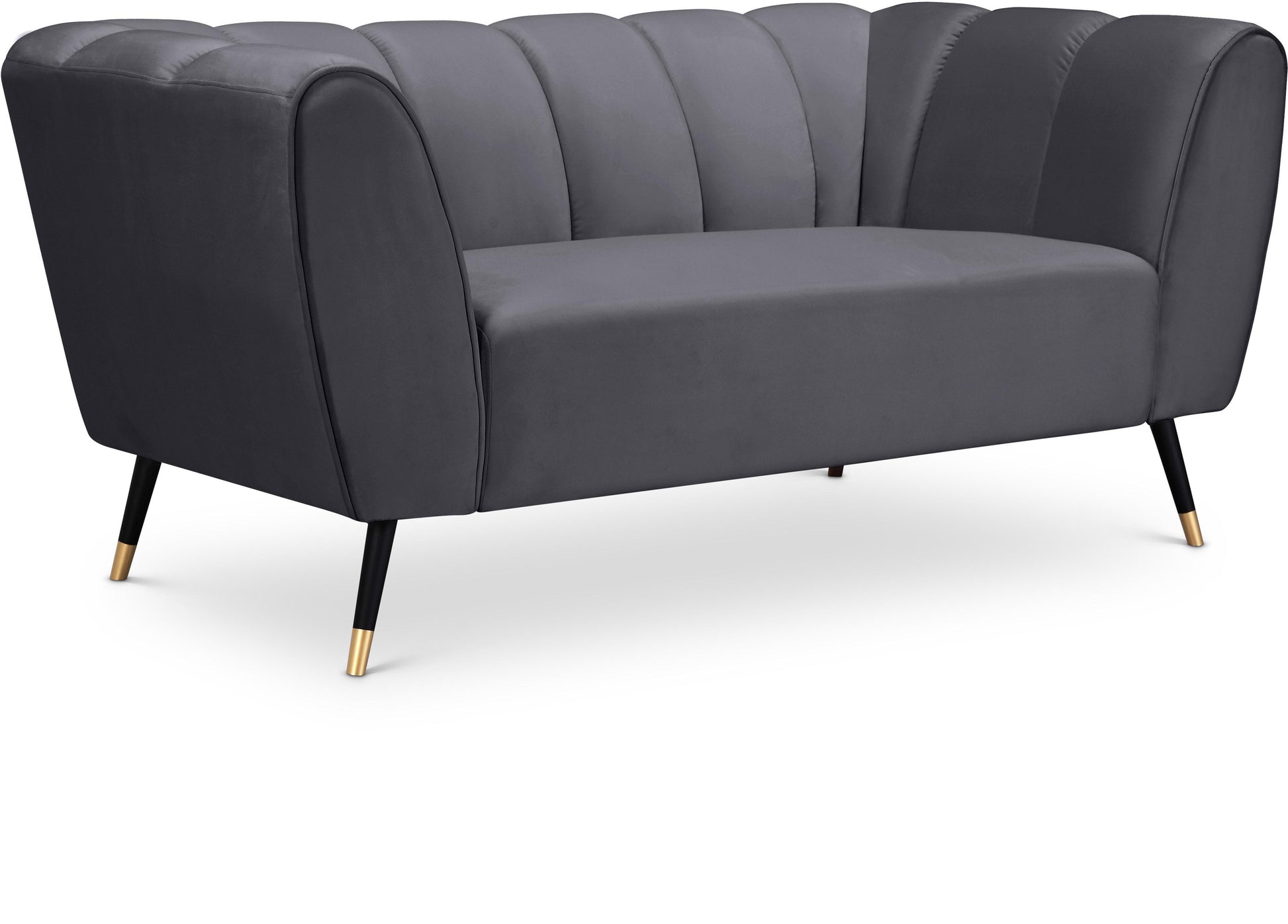 Sink your body into the inviting comfort of this Beaumont velvet love seat. Upholstered in a soft shade of grey with black metal legs tipped in gold, this chair oozes modern charm and up-to-the-minute comfort. The heavily stuffed arms, seat and back are bound to beckon at day���s end for you to sit and relax. Deep channel tufting on the back and arms adds to its uber welcoming look. Pair it with the matching pieces in the same collection for cohesive beauty.