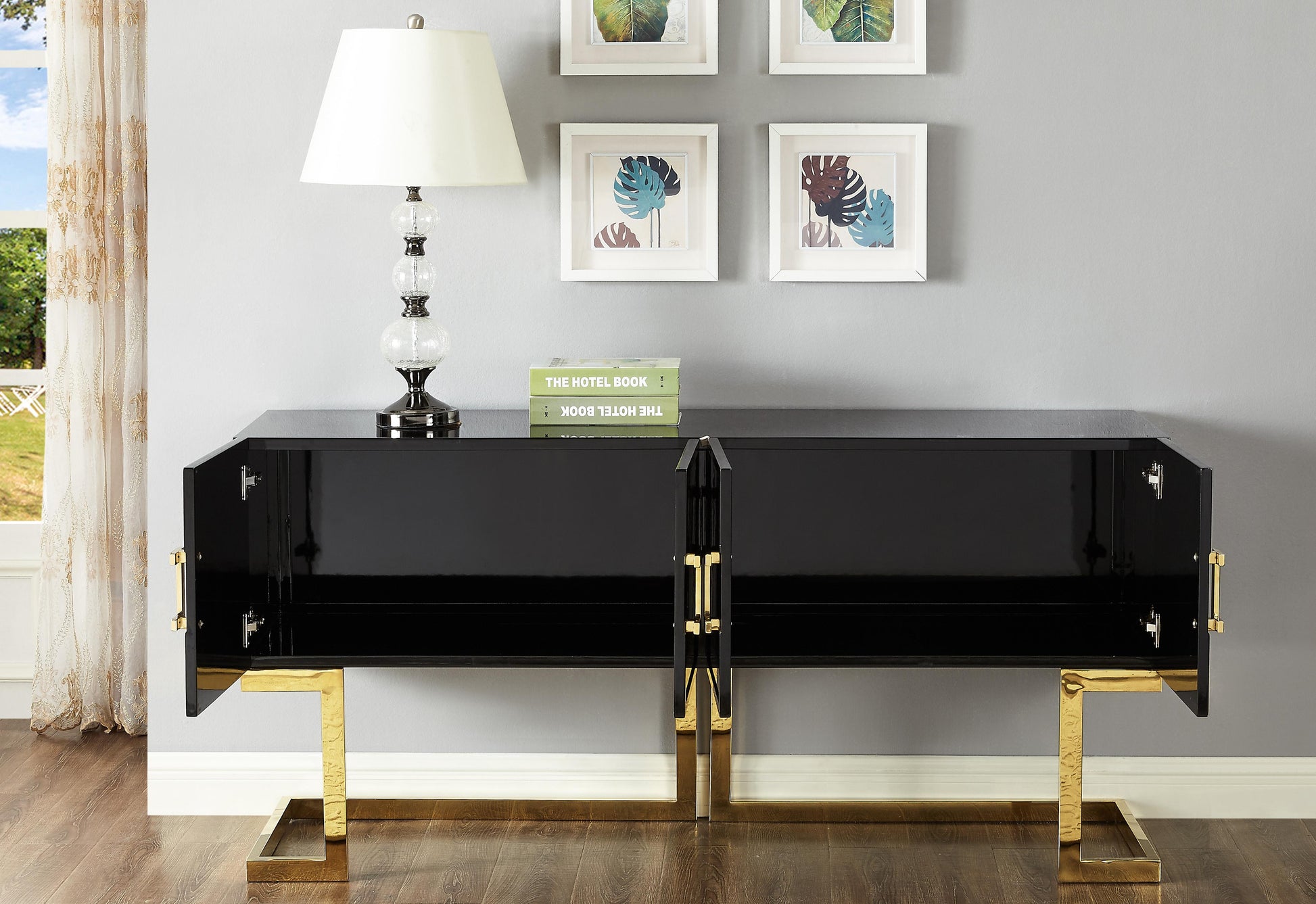 Ensure the items you need at mealtime are close at hand with this handsome Beth Sideboard Buffet from Meridian Furniture. This indispensable piece is a modern marvel with its contemporary design featuring black lacquer with a gold stainless steel trim and base. Open the doors to reveal a large area that's suitable for storing everything from serving bowls to out-of-season dinnerware.