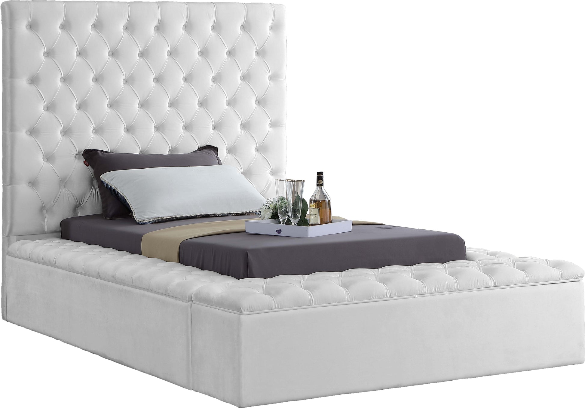 Extend elegance to the bedroom with this Bliss white velvet bed. This bed has a rich look, with deeply tufted upholstery along its upper platform perimeter and headboard, ensuring that it is a good fit in modern bedroom themes. Storage rails and footboard are included to ensure maximum versatility, and the bed comes with full slats, so you can use it without a box spring. The white velvet fabric used in its design makes it easy to integrate alongside other furnishings.