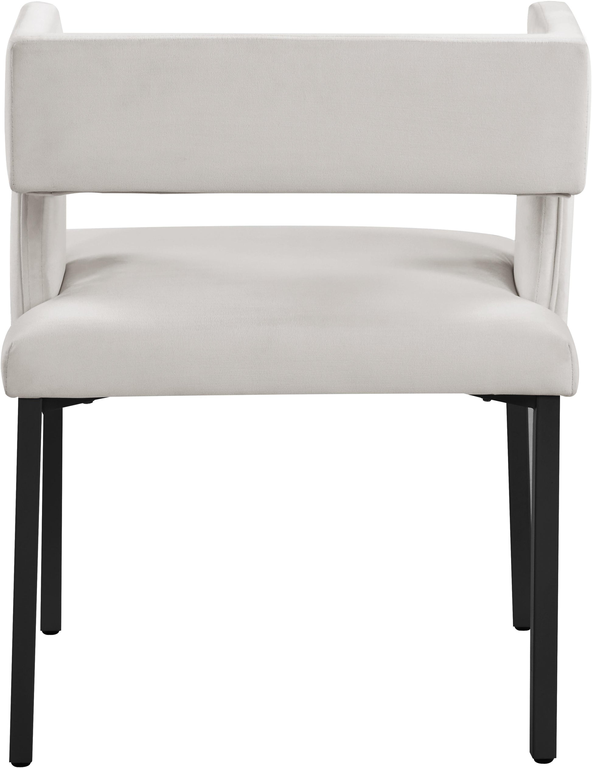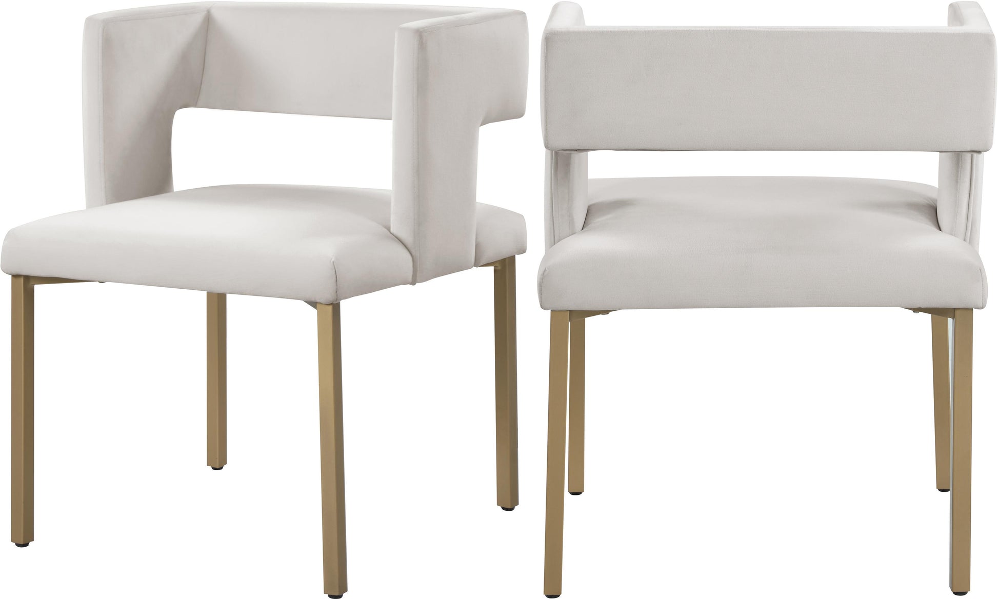 Add the Caleb cream velvet dining chair to your dining room for the ultimate in comfort and style. This chair has a square seat and low back which is open at the bottom to the rear and on the sides. Four brushed gold square iron legs provide support and stability, while the chair's soft velvet and cushioning offer an air of luxury. Several available tables make a perfect companion to this contemporary piece.