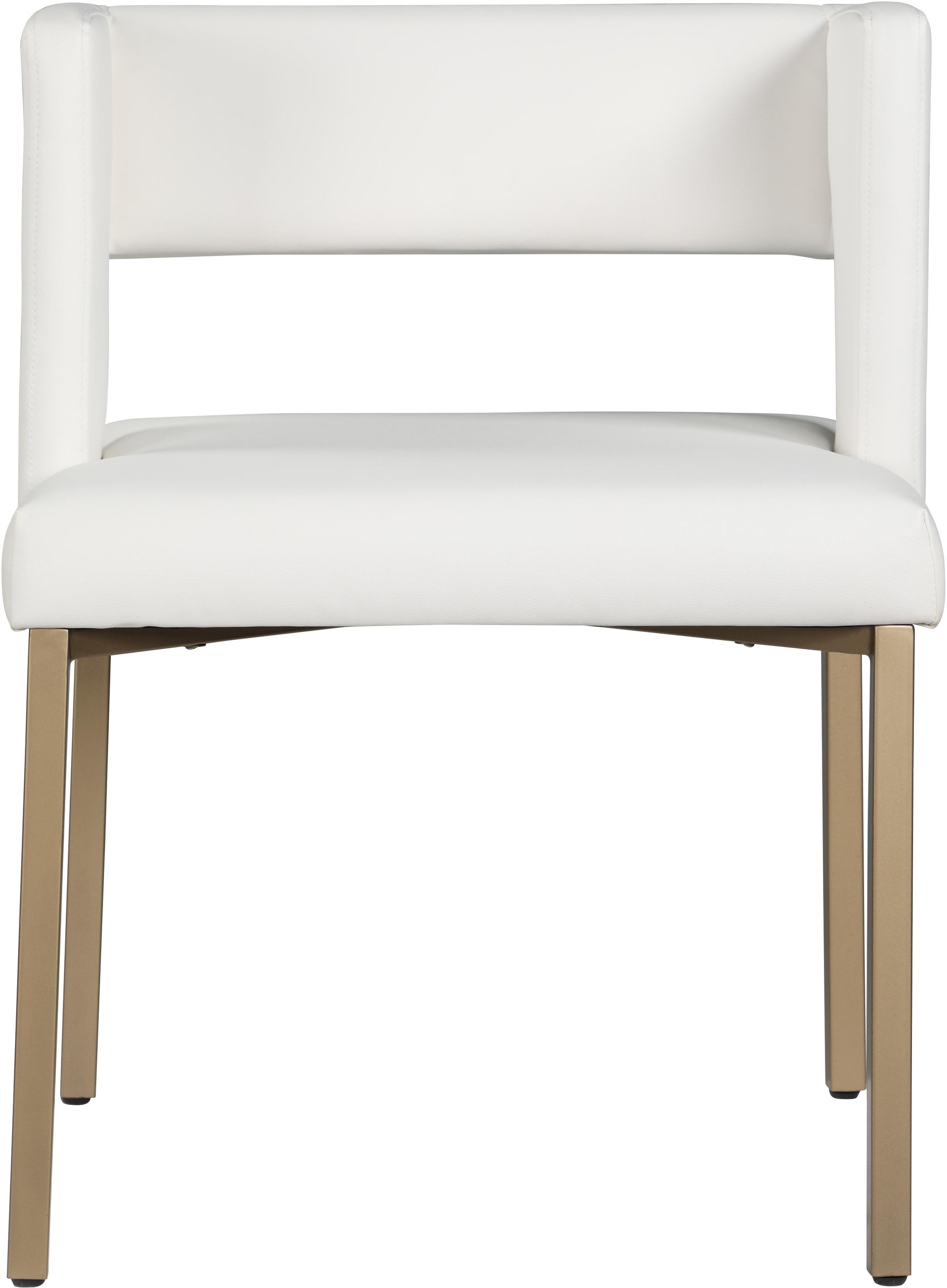 Add the Caleb white faux leather dining chair to your dining room for the ultimate in comfort and style. This chair has a square seat and low back which is open at the bottom to the rear and on the sides. Four brushed gold square iron legs provide support and stability, while the chair's soft velvet and cushioning offer an air of luxury. Several available tables make a perfect companion to this contemporary piece.