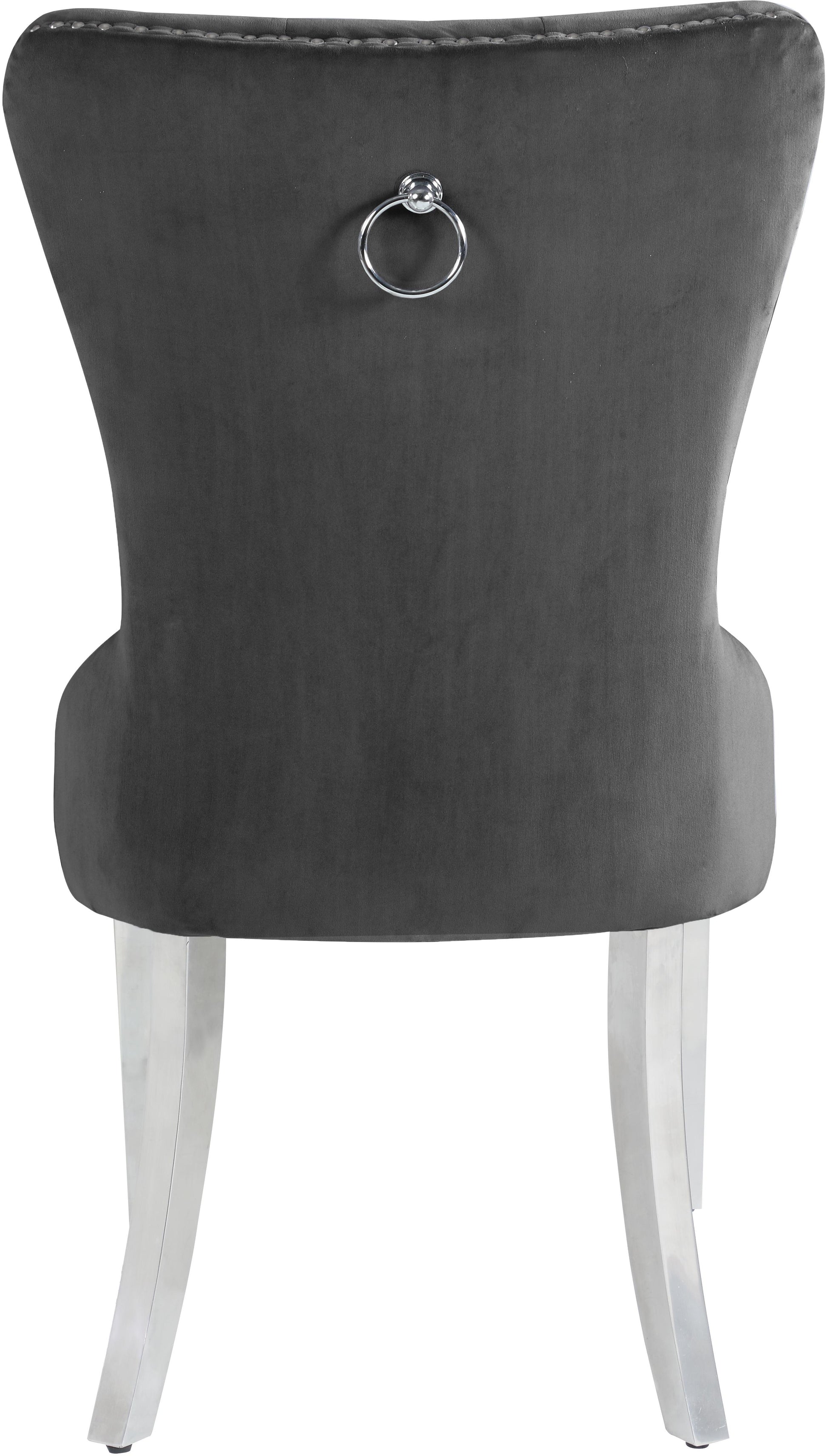 Transform your living space into a chic haven with this Carmen Grey Velvet Dining Chair. This eye-catching high-back chair offers plenty of back support, while its luxurious grey velvet upholstery and deep button tufting provides a soft texture, enabling you to recline in comfort and elegance. Chrome metal legs provide sturdy, durable support, and a matching chrome knocker on the chair's back gives it a unique, stylish touch that adds that extra bit of oomph to your contemporary home.