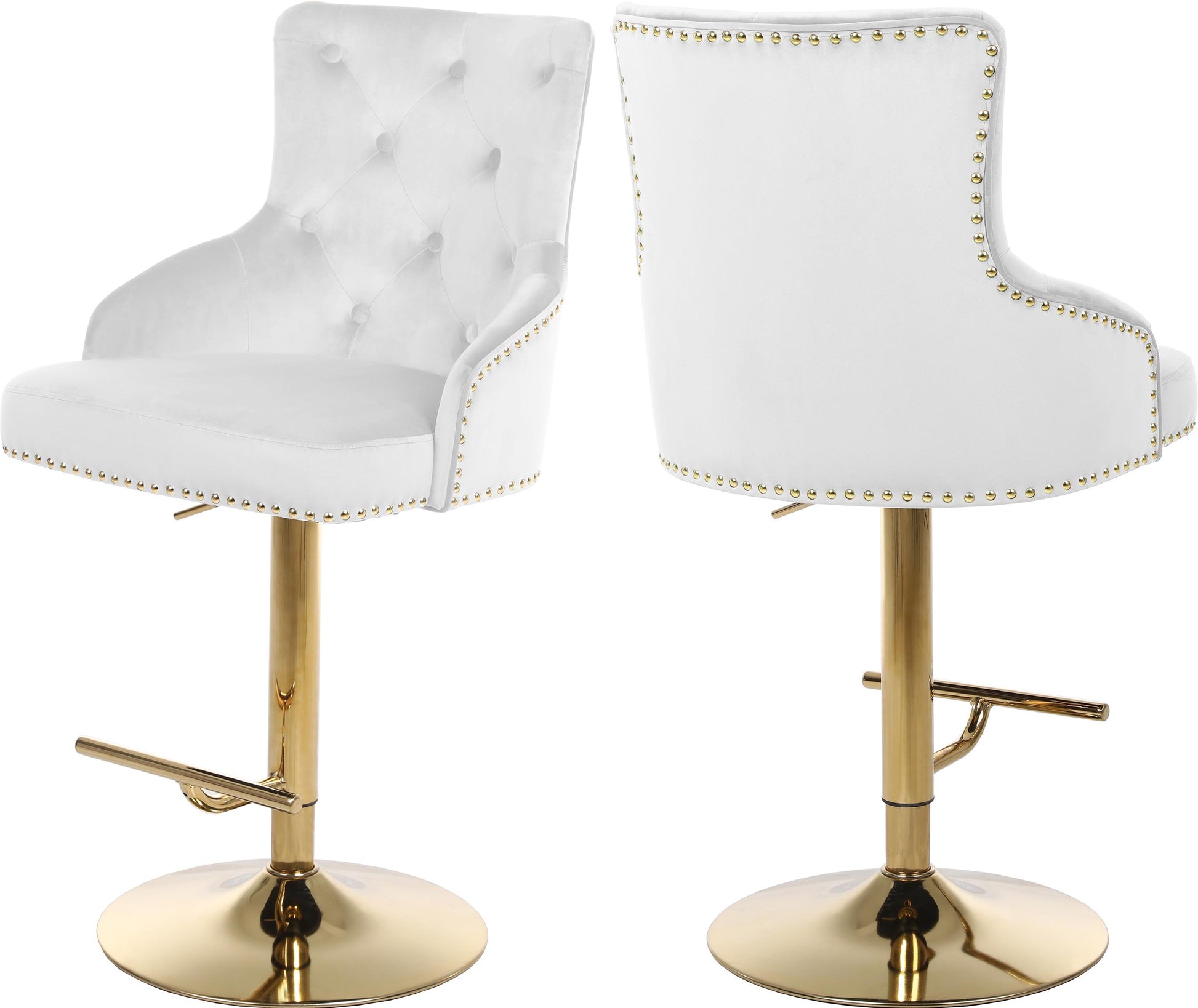 Make this Claude White Velvet Adjustable Stool everyone's new favorite seat. The high-back design supports guests in comfort, while rich velvet upholstery in a crisp white color gives the stool a svelte, modern look. Chrome nailhead trim adds another level of luxury, and the tufted design enables the cushioned back to keep its loft for maximum comfort. Add it to the bar or the kitchen counter to create a modish vibe in your room.
