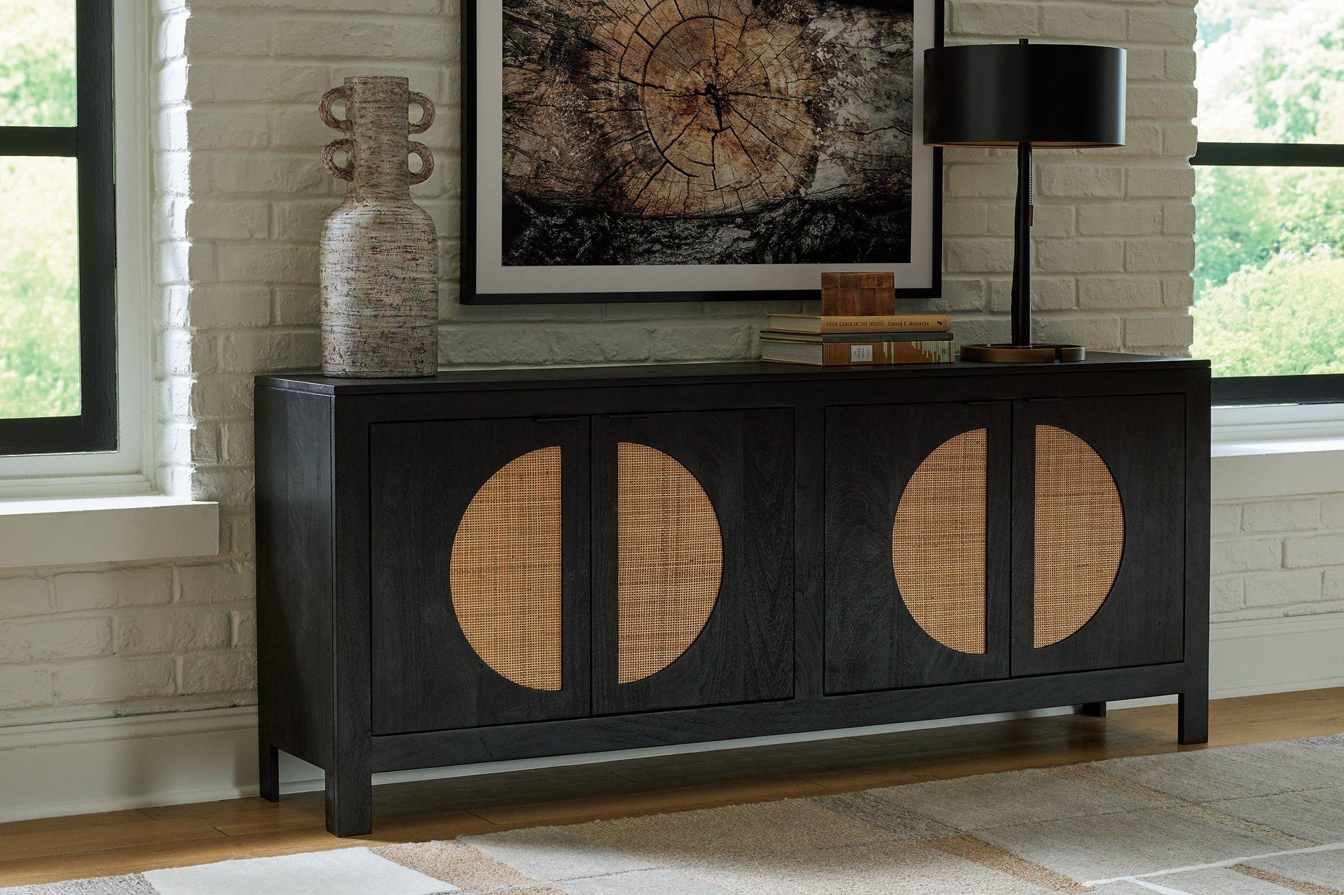 Bring high style and functionality to your home with this contemporary accent cabinet. Woven cane door fronts and a contrasting black finish bring the wow factor to this mid-century inspired piece. Whether it suits your storage needs in the dining room, home office or entryway, it's quite a showpiece.More About This Product