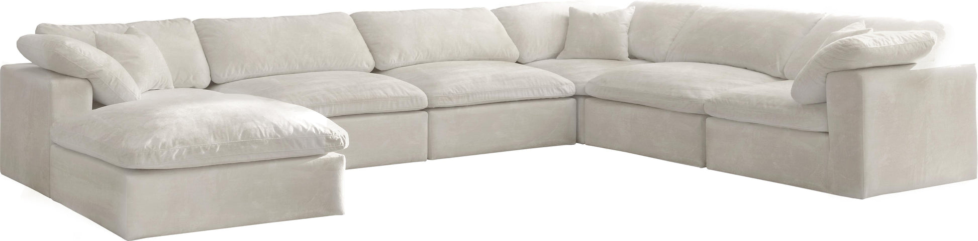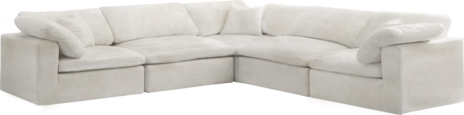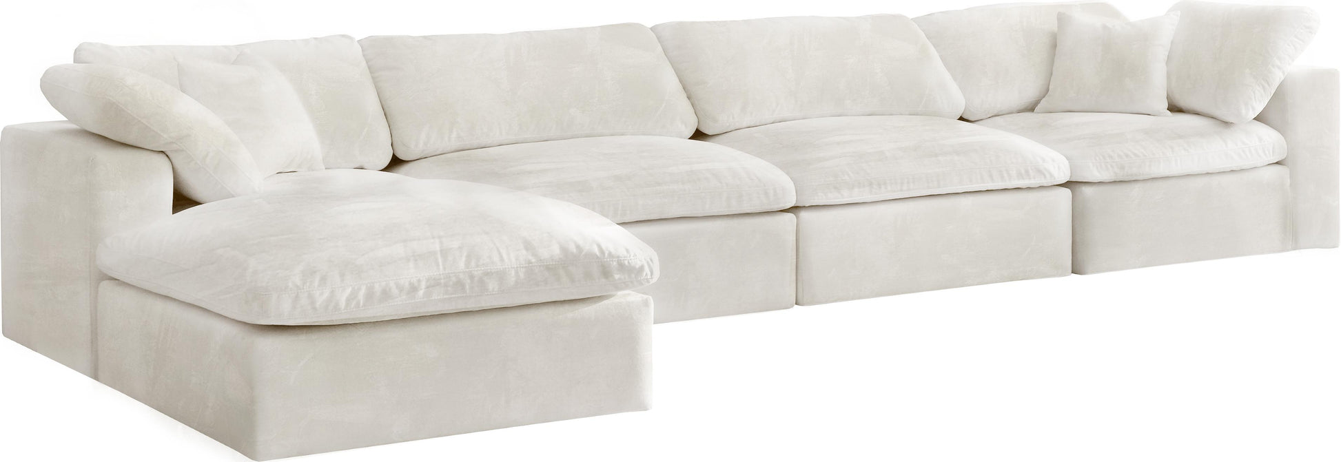 Bring home this Cozy 4-piece sectional for a fresh new look. Embrace casual elegance with this Cozy velvet cloud modular down-filled seating option. Handsome from all angles, this piece features soft cream velvet upholstery to make it an easy fit in any room. This modular piece can be combined with other items in the Cozy collection to create a seating group of your dreams. The cushions on this piece are exceptionally comfortable���and filled with down for luxury that you deserve as you rest and relax.