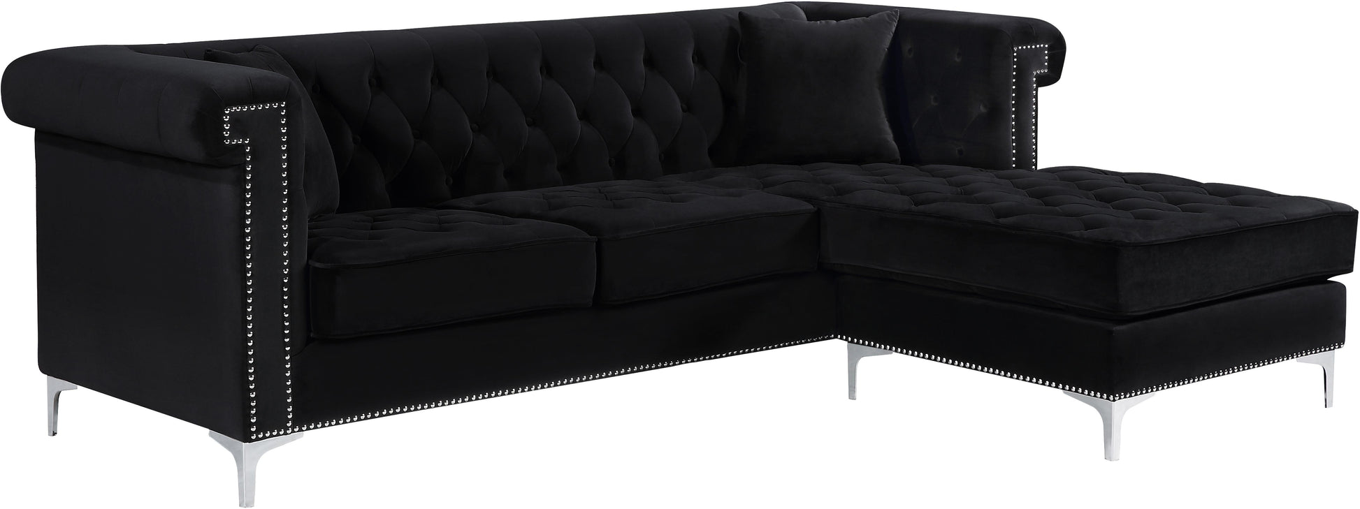 Curl up and take it easy on this two-piece Damian black velvet reversible sectional sofa. A reversible chaise on one end ensures you have a perfect spot for a nap, and the sectional seats the whole family, making it easy to stay comfortable while you hang out. The deep black color makes this sectional sofa easy to coordinate with existing items in your home, and its plump backs and plush seats ensure that this piece quickly becomes everyone's favorite seat.
