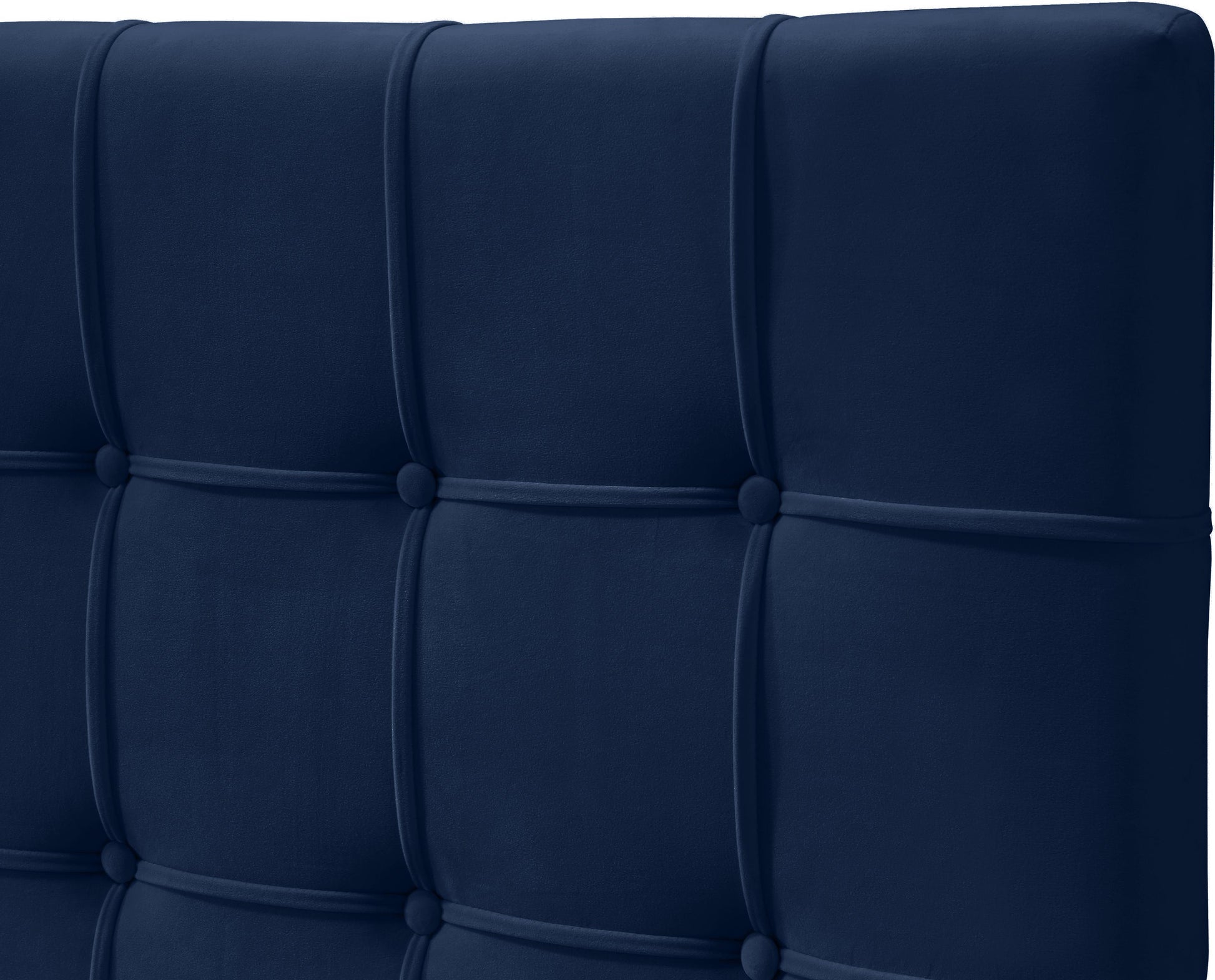Crawl into this cozy Elly navy velvet queen size bed for a restful night's sleep. The deep button tufting on its tall headboard provides a soft, pillowy surface to lean against for nighttime reading or watching TV. Supported by angled wood legs with an espresso finish, the side rails and footboard are also comfortably padded and upholstered. Contemporary styling ensures that this bed will integrate nicely into any existing d?�cor.