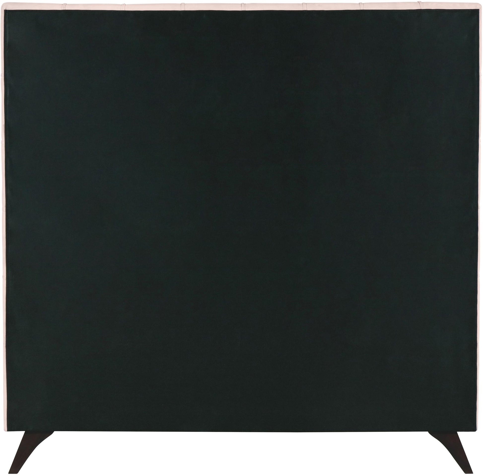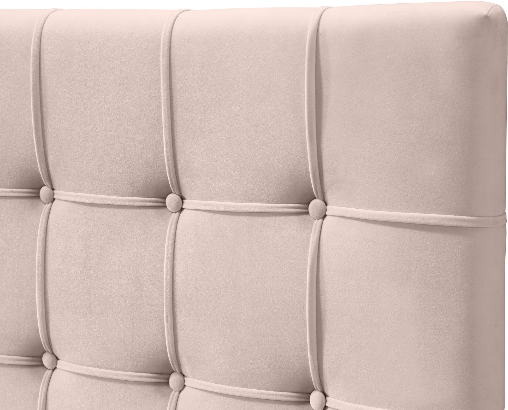 Crawl into this cozy Elly pink velvet full size bed for a restful night's sleep. The deep button tufting on its tall headboard provides a soft, pillowy surface to lean against for nighttime reading or watching TV. Supported by angled wood legs with an espresso finish, the side rails and footboard are also comfortably padded and upholstered. Contemporary styling ensures that this bed will integrate nicely into any existing d?�cor.