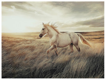 This wall art brings serene beauty to your home. This captivating print on glass captures the grace and majesty of a wild horse galloping through a golden field. The warm, earthy tones and dynamic composition create a sense of freedom and movement. It's a perfect choice to enhance your wall decor with nature-inspired artistry.More About This Product