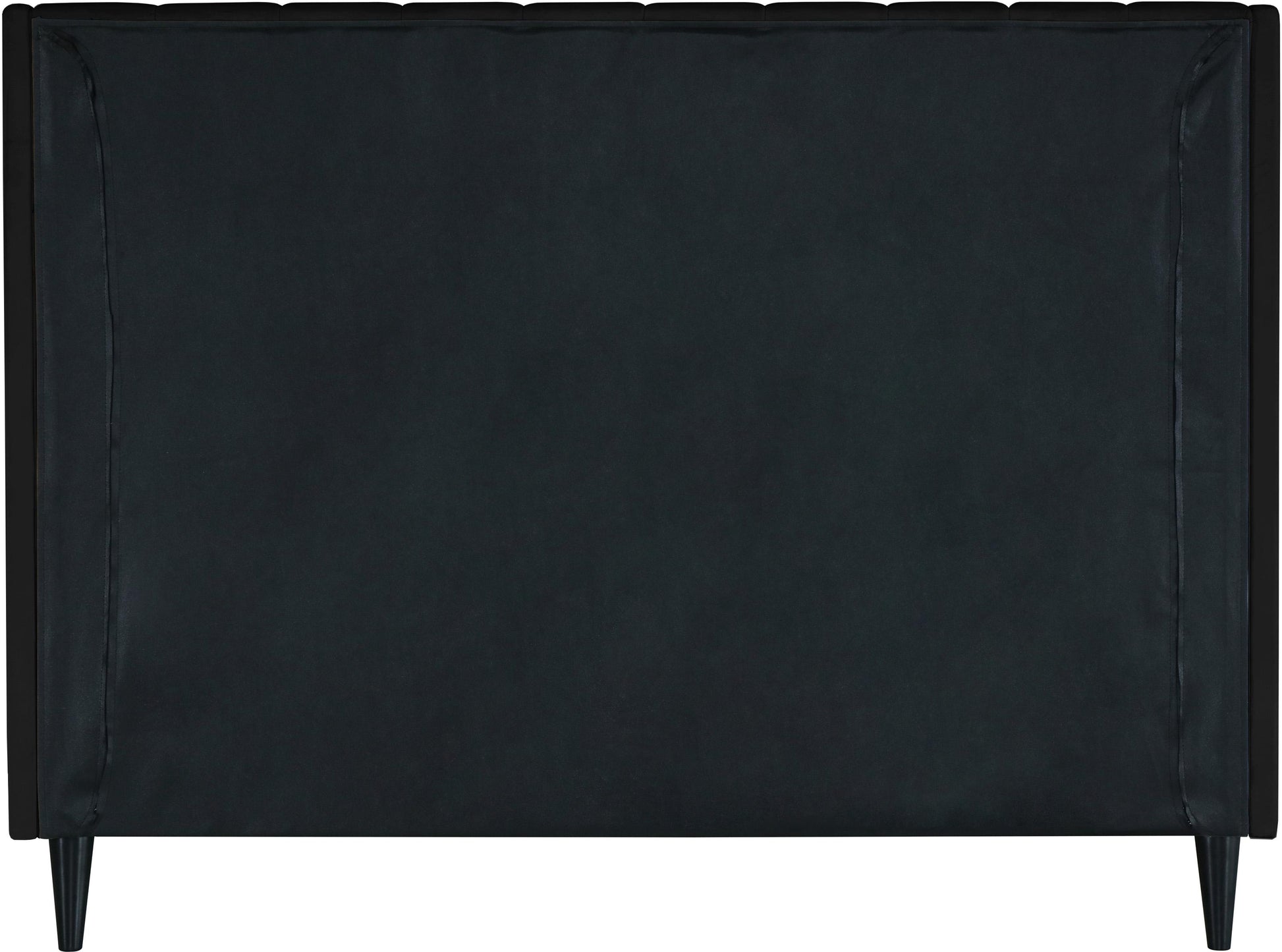 Snuggle up to a pet or other loved one in this richly upholstered Eva black velvet full size bed for the ultimate in rest and relaxation. The wing back headboard has cushioned vertical deep channel tufting, and both the side rails and footboard are upholstered too for your comfort. Tapered black wood legs match the upholstery and support this contemporary bed, elevating it sufficiently that you can store items underneath.