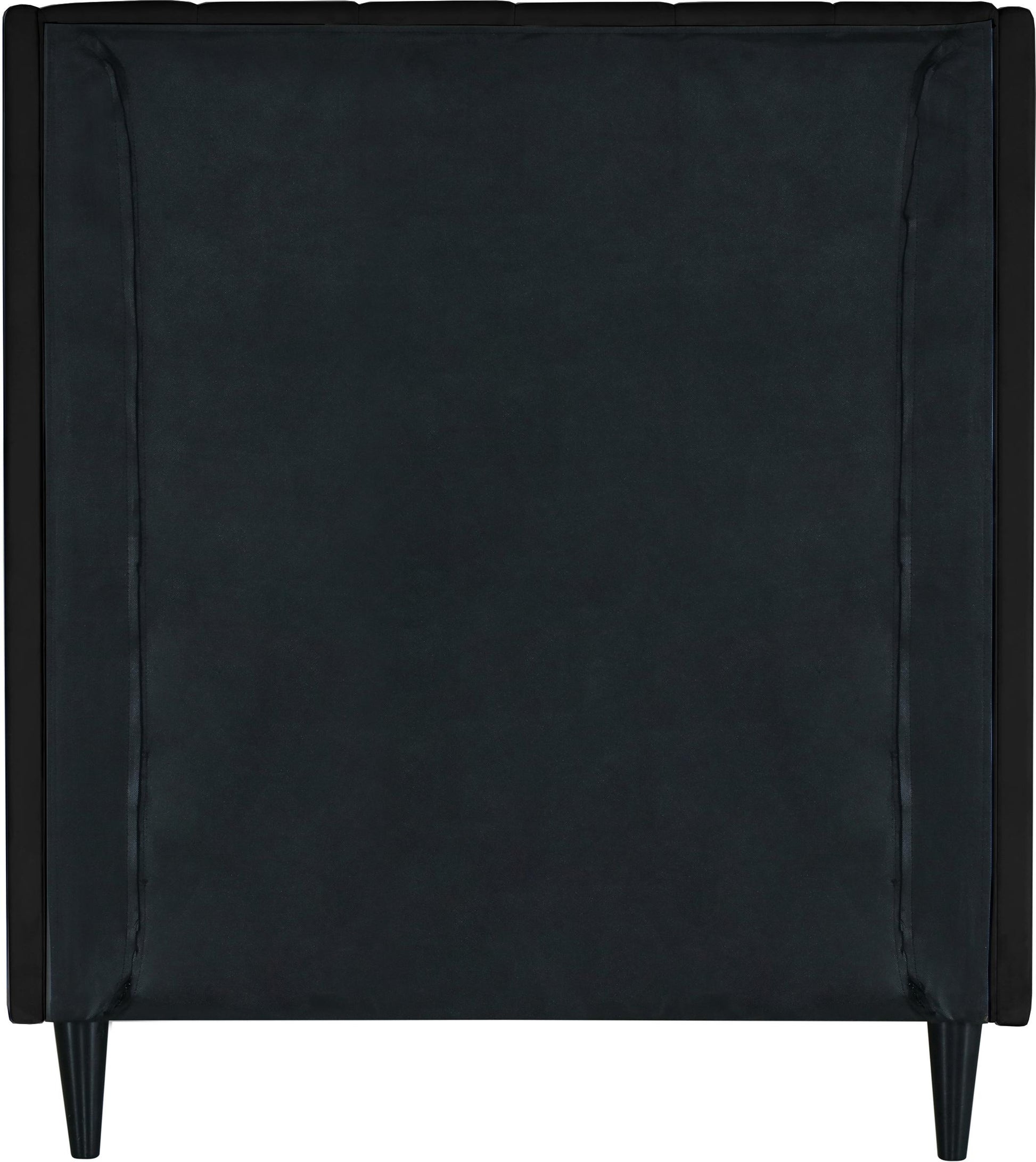 Snuggle up to a pet or other loved one in this richly upholstered Eva black velvet twin size bed for the ultimate in rest and relaxation. The wing back headboard has cushioned vertical deep channel tufting, and both the side rails and footboard are upholstered too for your comfort. Tapered black wood legs match the upholstery and support this contemporary bed, elevating it sufficiently that you can store items underneath.