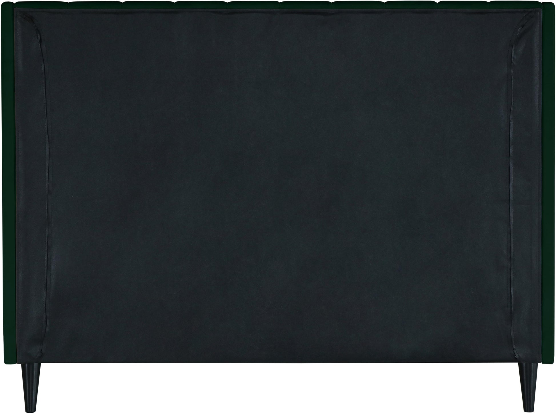 Snuggle up to a pet or other loved one in this richly upholstered Eva green velvet queen size bed for the ultimate in rest and relaxation. The wing back headboard has cushioned vertical deep channel tufting, and both the side rails and footboard are upholstered too for your comfort. Tapered black wood legs match the upholstery and support this contemporary bed, elevating it sufficiently that you can store items underneath.