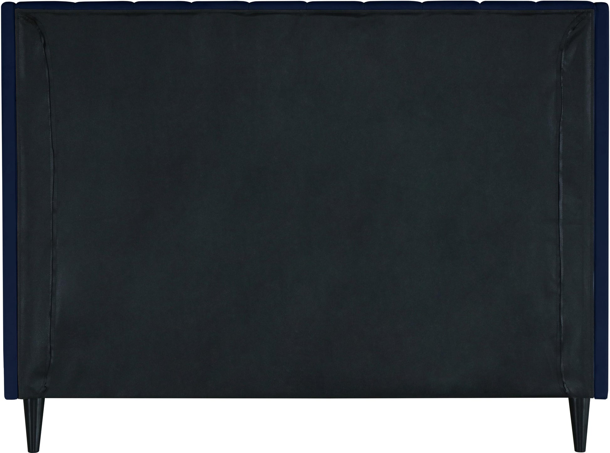 Snuggle up to a pet or other loved one in this richly upholstered Eva navy velvet full size bed for the ultimate in rest and relaxation. The wing back headboard has cushioned vertical deep channel tufting, and both the side rails and footboard are upholstered too for your comfort. Tapered black wood legs match the upholstery and support this contemporary bed, elevating it sufficiently that you can store items underneath.