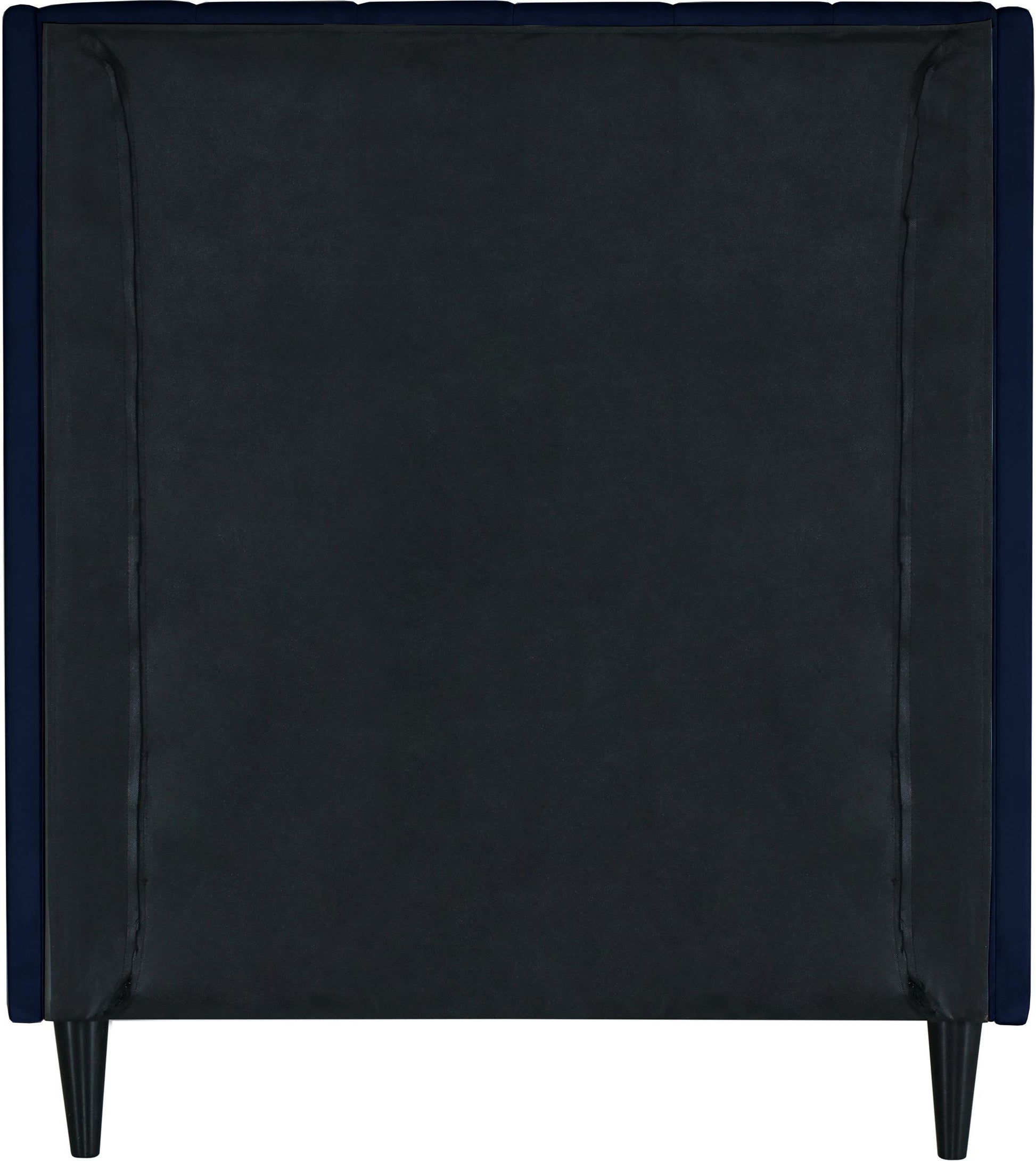Snuggle up to a pet or other loved one in this richly upholstered Eva navy velvet twin size bed for the ultimate in rest and relaxation. The wing back headboard has cushioned vertical deep channel tufting, and both the side rails and footboard are upholstered too for your comfort. Tapered black wood legs match the upholstery and support this contemporary bed, elevating it sufficiently that you can store items underneath.