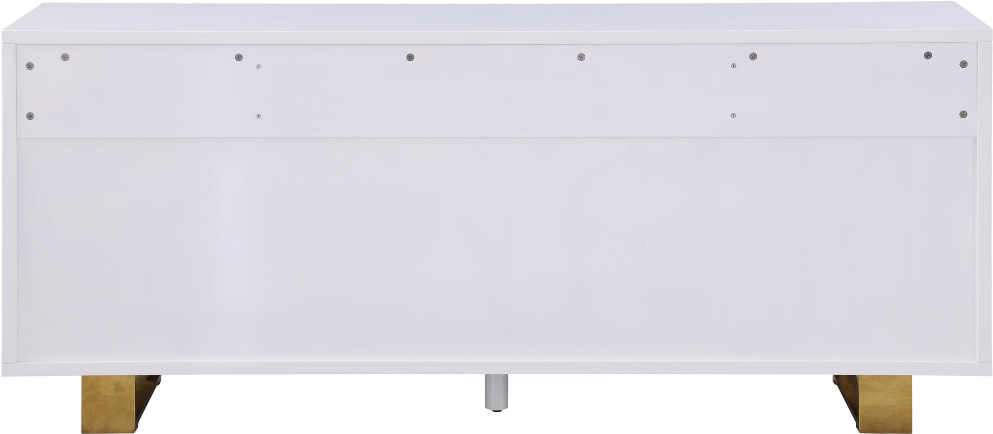 Organize flatware and silverware in the three spacious drawers of this Excel sideboard buffet. This beefy sideboard offers room aplenty for holding things you need in the dining room���out of sight and out of mind. The rich white lacquer finish with gold base and handles gives this unit the modern panache needed to mesh with nearly any contemporary dining set. Wood and stainless steel construction ensures lasting beauty and long-lived performance.