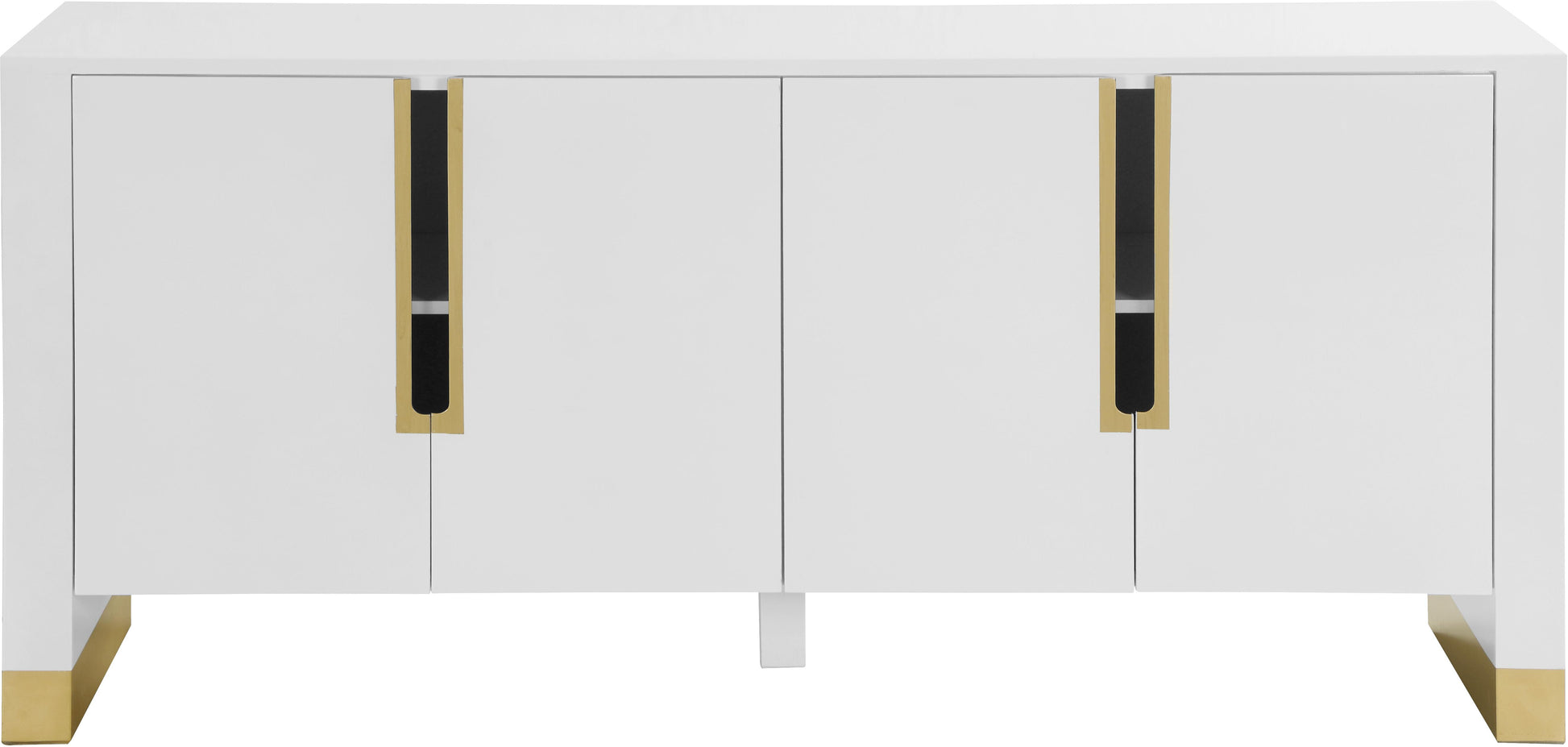 Make a bold statement in your living space with this eye-catching Florence Sideboard/Buffet from Meridian Furniture. Its deep navy blue lacquer is complemented by a gold finished base, creating a contemporary design that's both modern and stylish. Four side cabinet doors open up to reveal four cubby spaces, giving you ample room to safely tuck away dishes, pots and pans, knick-knacks, books, or other household items, while the top of the sideboard/buffet doubles as shelf space for items you want on display.