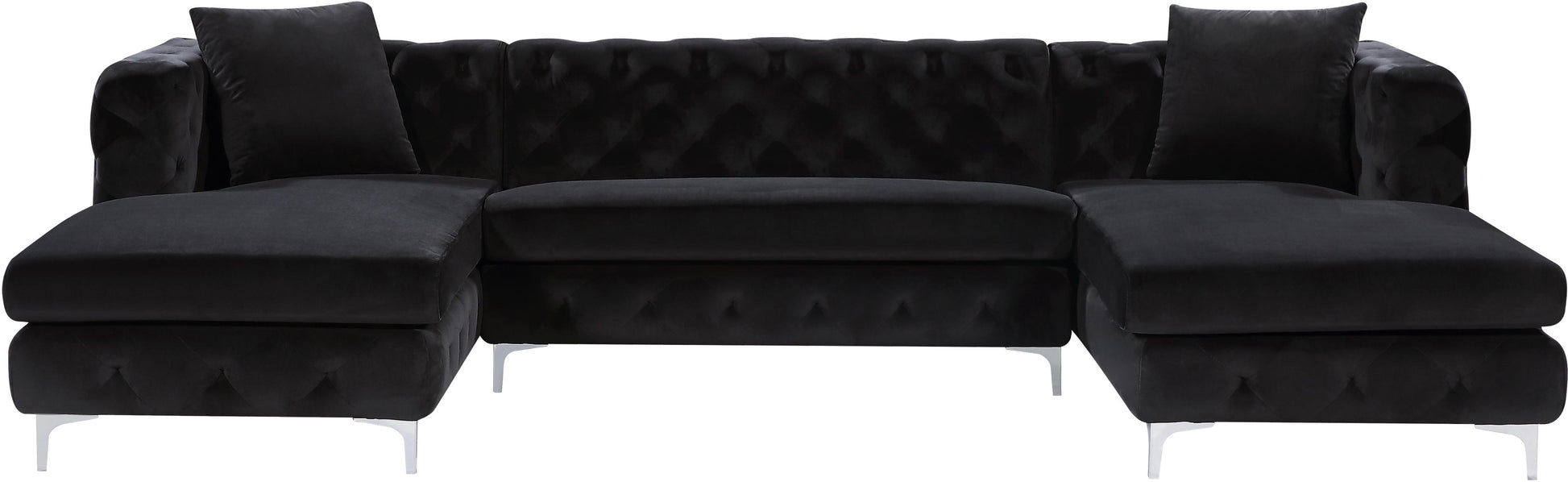 Bring fine living to the forefront with this Gail three-piece sectional. This black-colored sectional features two chaise ends, giving you the room you need to snuggle up and get comfortable on movie night. The upholstery is made from velvet and simply luxurious to the touch. Deep tufting all over the backs and sides of this unit add to its glamorous vibe, while the chromed legs finish off the design on a modern note. This sectional comes with pillows for added comfort and style.