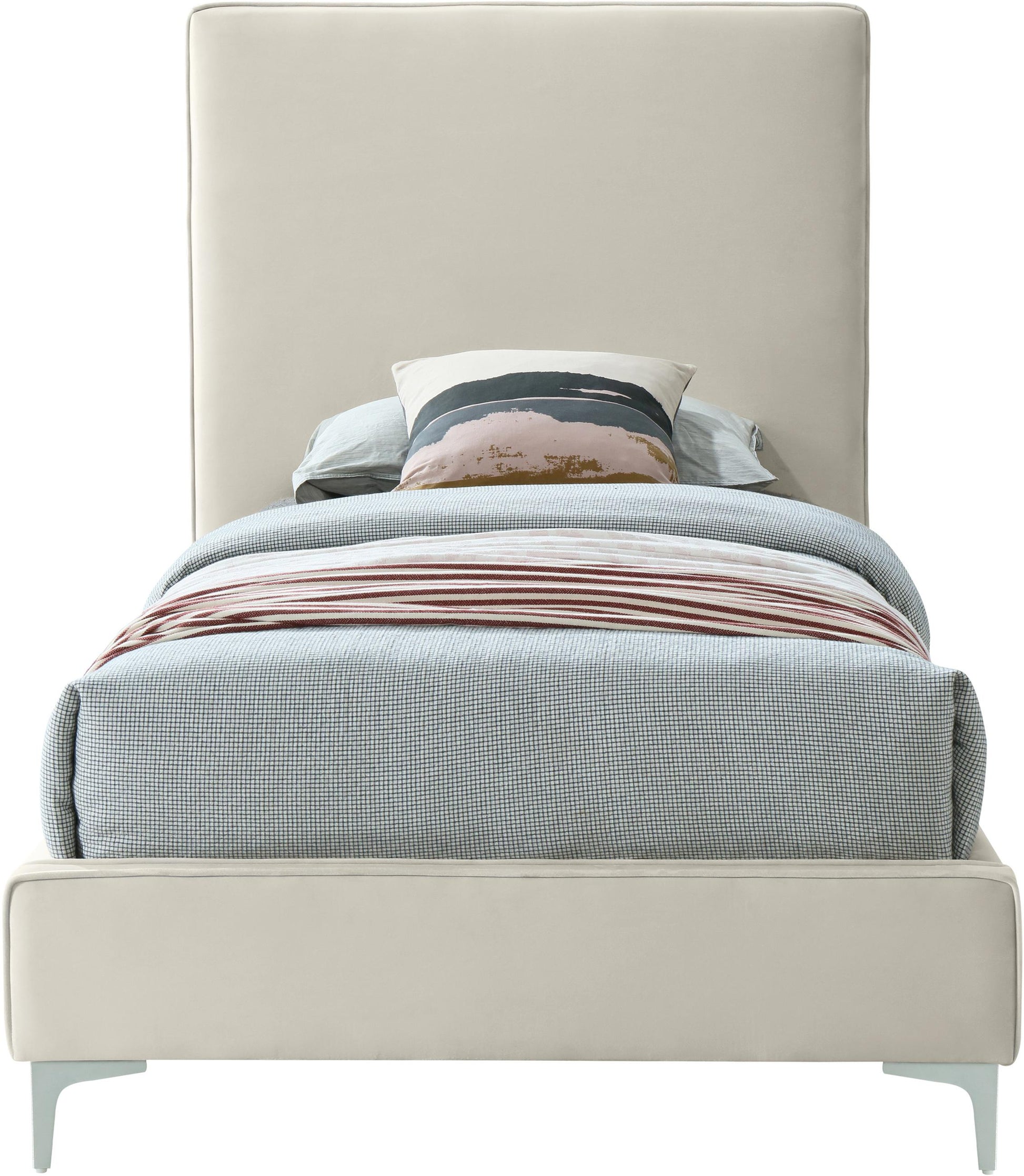 Provide yourself with a few options when you choose the sleek Geri cream velvet twin size bed. The headboard, side rails and footboard are all cushioned and upholstered, with snazzy decorative piping on the headboard and footboard. This bed comes with two different sets of legs so you can match your other d?�cor. Use the gold ones, the chrome ones, or two of each color for a truly contemporary approach.