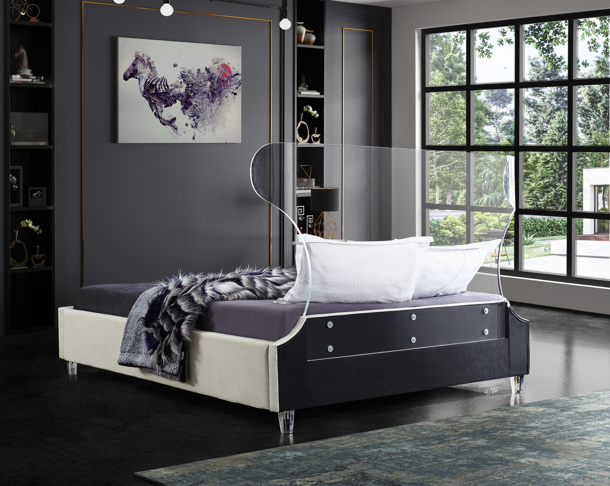 There's nothing scary about the Ghost cream velvet queen size bed, with its plush cushioned and upholstered side rails and footboard. A curved transparent acrylic headboard allows you to situate it in front of a window without blocking the view, and matching acrylic legs offer a beautiful contemporary appearance. This bed has a complete set of slats included for your convenience, so you won't need to purchase a box spring.