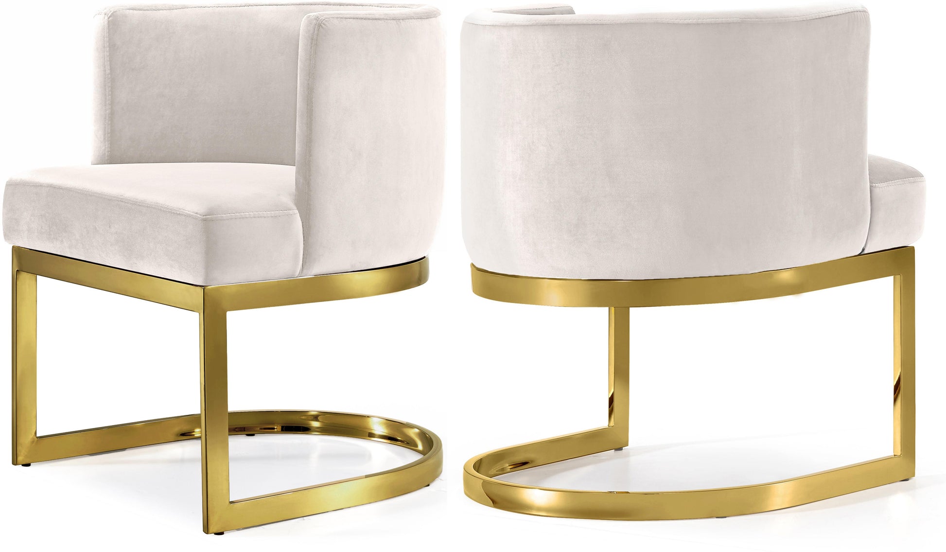Lend your dining area a touch of retro charm with the Gianna Cream Velvet Dining Chair from Meridian Furniture. The back of the chair has a barrel design that cradles you in comfort while you enjoy a meal with friends, and the chair is thickly padded and upholstered in plush cream velvet for a luxe feel. The base is made from stainless steel with a gold finish for a finish that's stunningly beautiful.