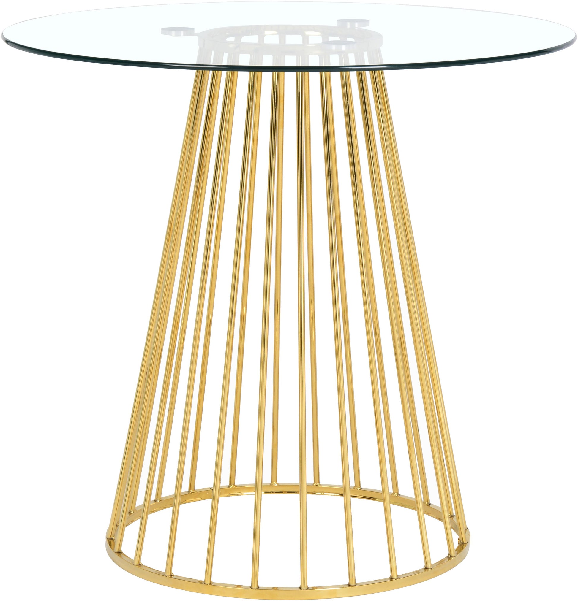 Add a bold touch to your dining area with this chic Gio counter height table. Featuring a round, clear tempered glass tabletop and a polished gold metal base with a wired contemporary design, this dining table transforms your dining space into a stylish haven. At 40 inches round and 37 inches high, this stunning table offers ample space for you to gather around and enjoy a family meal, while adding drama to your existing modern decor.