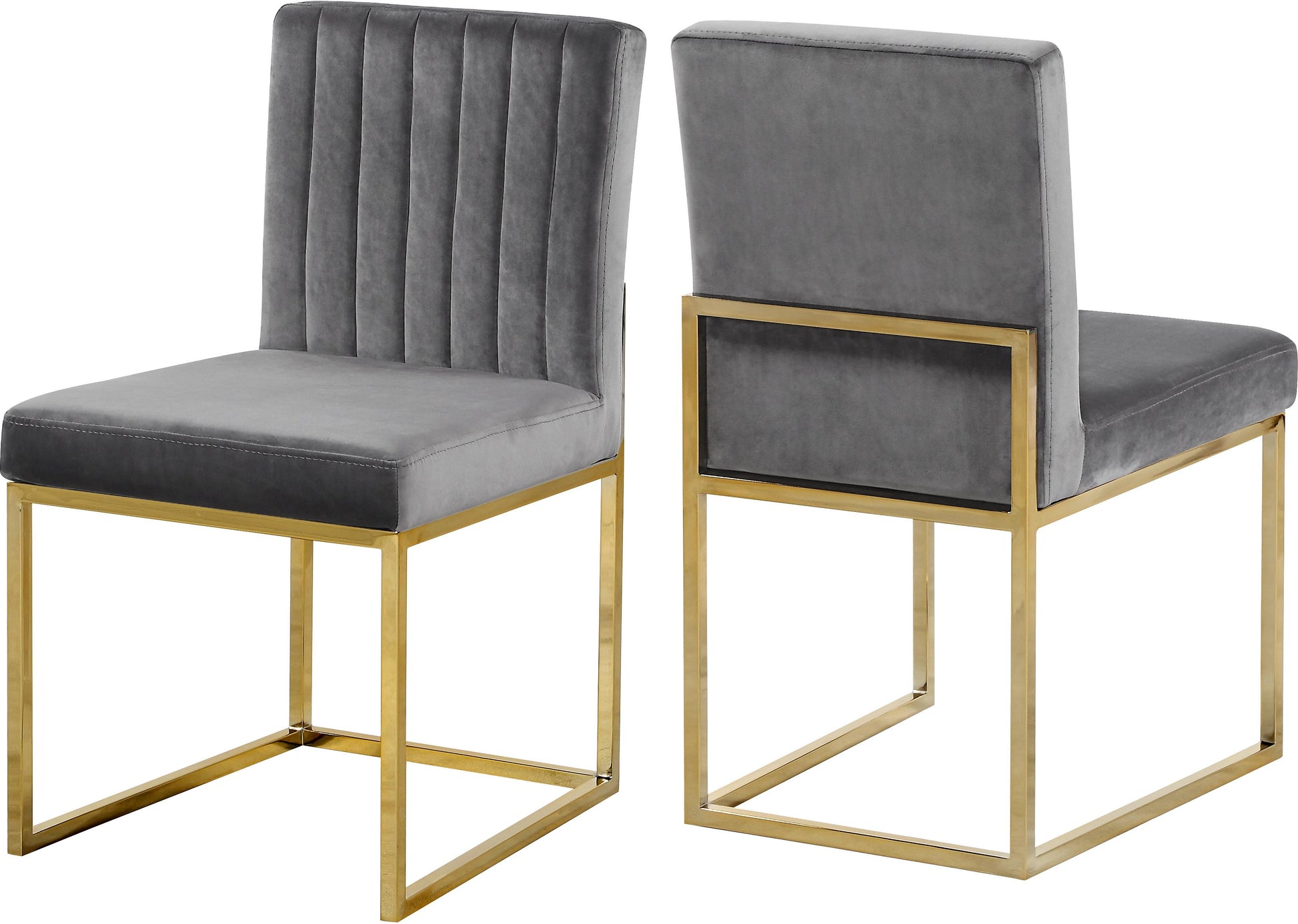 Take dining to a posh new level with this Giselle Grey Velvet Dining Chair. A boxy design makes it a nice addition to contemporary spaces, and it's armless design makes it easy to get into and out of with ease. The seat and back are upholstered in rich grey velvet for a lavish vibe and a pop of sumptuous color to liven up your room, and both are padded well to make sure diners stay comfy while they enjoy their meal. The metal frame is finished in gold for added beauty and aesthetic appeal.