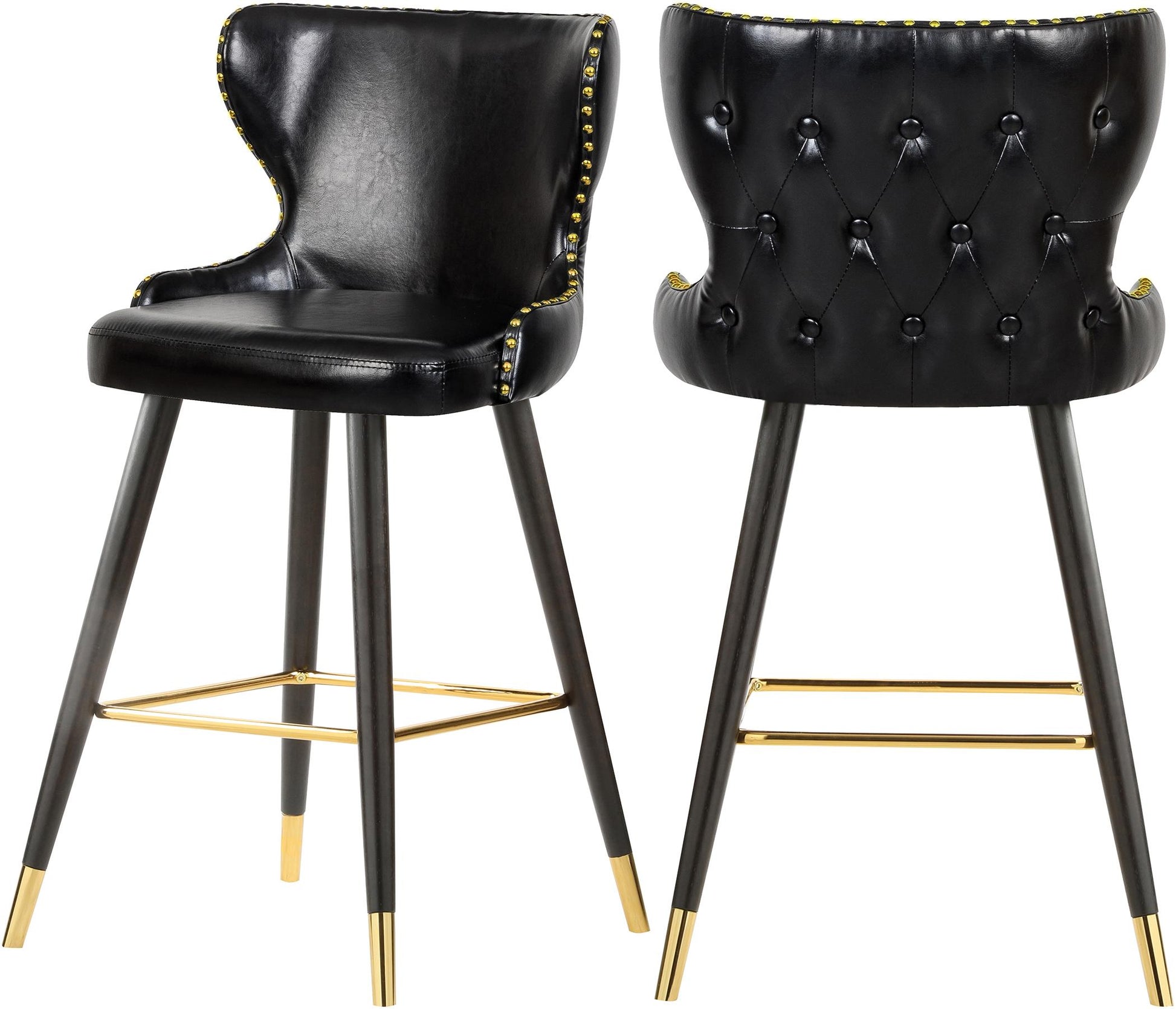 Sit comfortably and stylishly in this Hendrix faux leather bar and counter stool. This handsome stool features black faux leather upholstery on the seat and back, ensuring that you get a luxe and refined look without paying a lot. But don���t worry���no one will know that this buttery soft upholstery is not the genuine thing. The stool���s espresso wood legs and gold footrest with gold caps lends it a definitive contemporary punch.