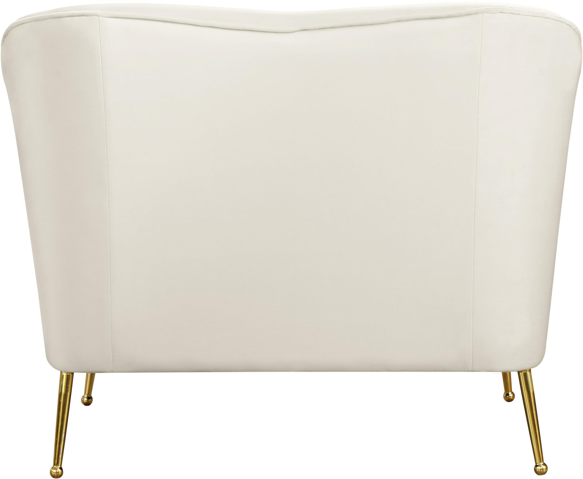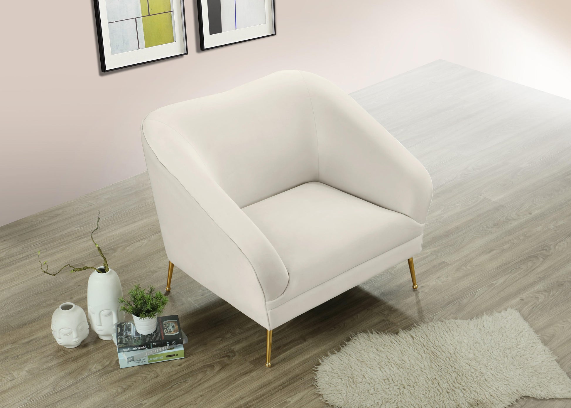 Create instant drama in your room with this Hermosa Velvet Chair by Meridian Furniture. The mid-century design makes the chair a true standout among other furnishings, with its sleek curved back and arms that create an aesthetically pleasing silhouette. The soft cream velvet upholstery feels sleek and sumptuous to the skin and gives your room an upscale look. Gold legs finish off the design, each of them with a ball design on the foot for added sophistication.
