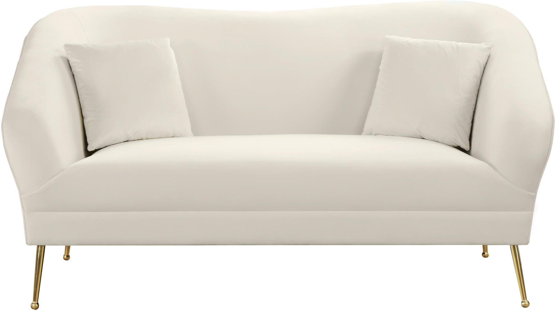 Create instant drama in your room with this Hermosa Velvet Loveseat by Meridian Furniture. The mid-century design makes the loveseat a true standout among other furnishings, with its sleek curved back and arms that create an aesthetically pleasing silhouette. The soft cream velvet upholstery feels sleek and sumptuous to the skin and gives your room an upscale look. Gold legs finish off the design, each of them with a ball design on the foot for added sophistication.
