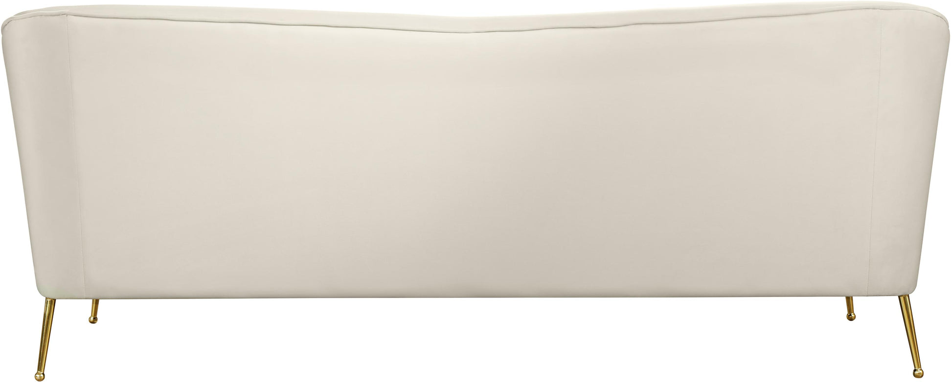 Create instant drama in your room with this Hermosa Velvet Sofa by Meridian Furniture. The mid-century design makes the sofa a true standout among other furnishings, with its sleek curved back and arms that create an aesthetically pleasing silhouette. The soft cream velvet upholstery feels sleek and sumptuous to the skin and gives your room an upscale look. Gold legs finish off the design, each of them with a ball design on the foot for added sophistication.