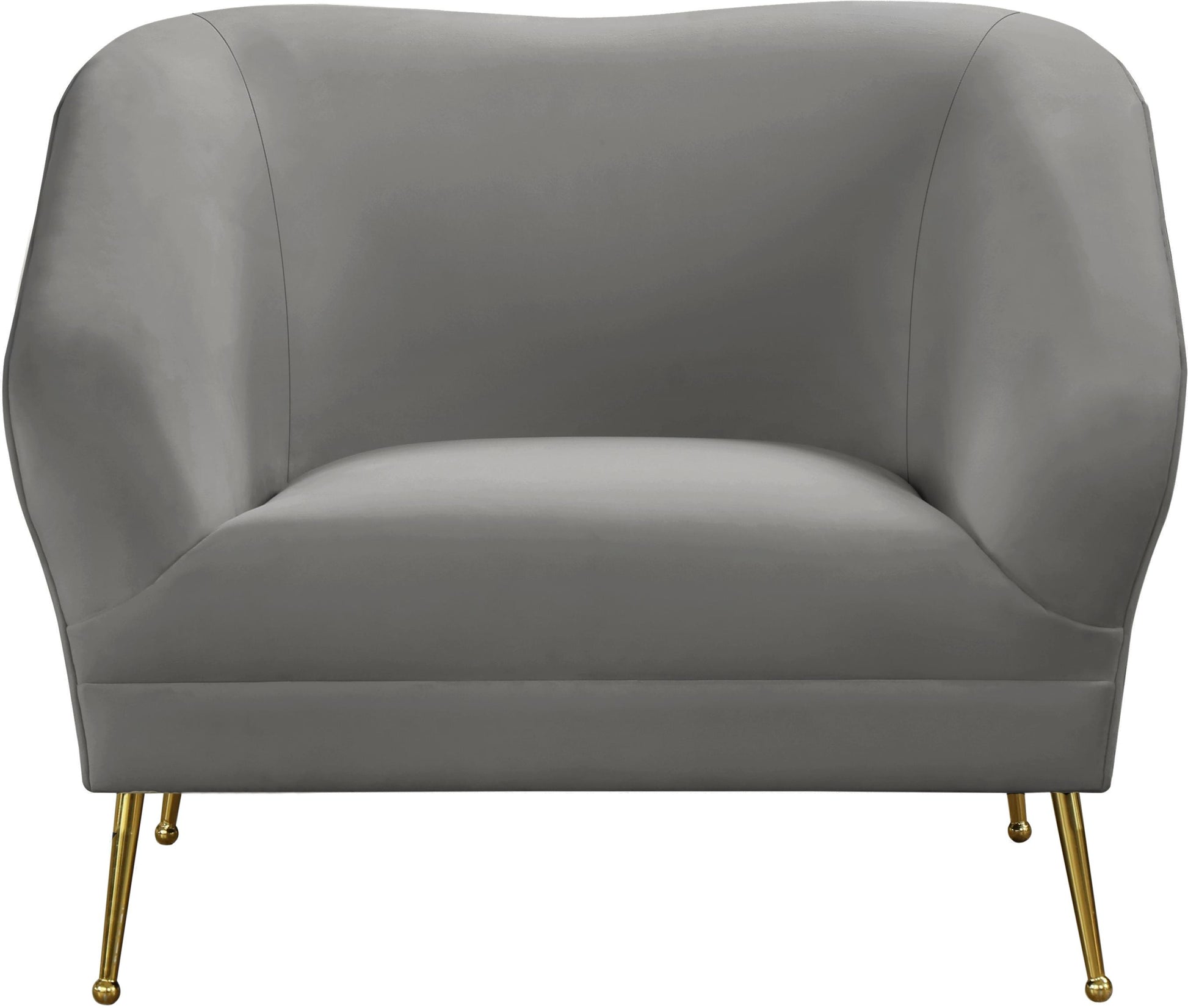 Create instant drama in your room with this Hermosa Velvet Chair by Meridian Furniture. The mid-century design makes the chair a true standout among other furnishings, with its sleek curved back and arms that create an aesthetically pleasing silhouette. The soft grey velvet upholstery feels sleek and sumptuous to the skin and gives your room an upscale look. Gold legs finish off the design, each of them with a ball design on the foot for added sophistication.