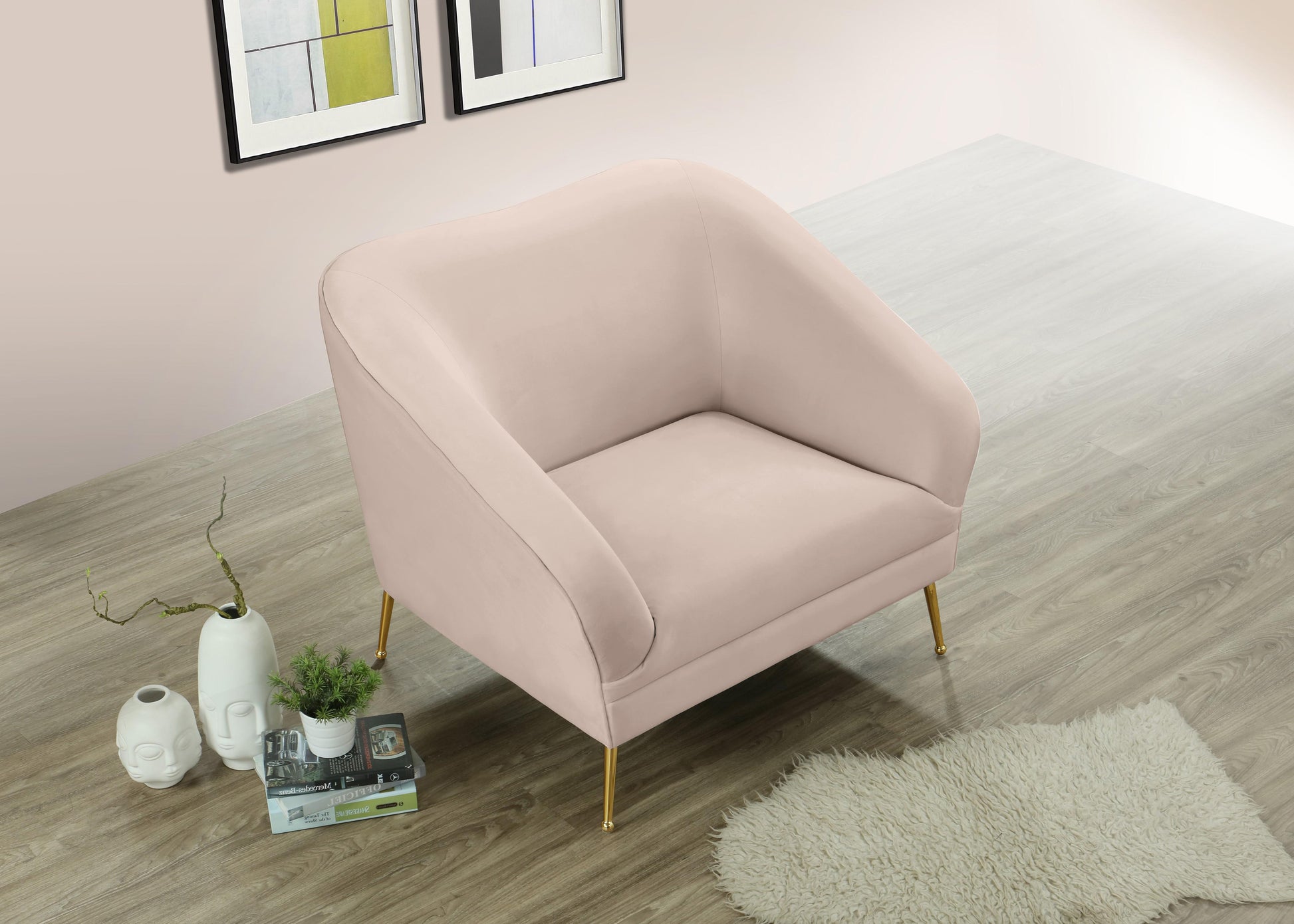 Create instant drama in your room with this Hermosa Velvet Chair by Meridian Furniture. The mid-century design makes the chair a true standout among other furnishings, with its sleek curved back and arms that create an aesthetically pleasing silhouette. The soft pink velvet upholstery feels sleek and sumptuous to the skin and gives your room an upscale look. Gold legs finish off the design, each of them with a ball design on the foot for added sophistication.