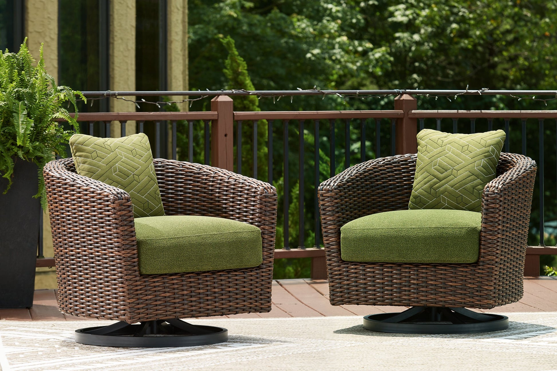 This outdoor swivel lounge chair recalls the aesthetics of nature to bring an inviting, high-style feel to your patio or lanai. Its Nuvella+™ performance fabric is made with enhanced UV resistance, so the chic green hue stays brighter for longer. Worried about the weather? Don't sweat it—the durable resin wicker withstands the elements from season to season.More About This Product