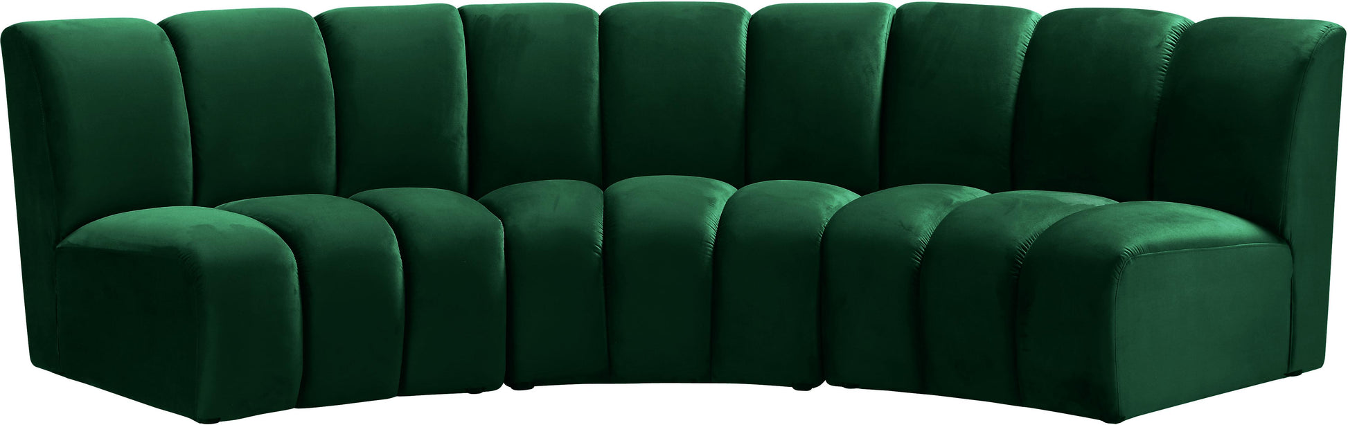 Create a seating group that works for every possible situation with this Infinity modular sofa and other pieces in the Infinity collection. Upholstered in soft green velvet material that feels great against the skin and offers long-wearing beauty, this piece fits with other Infinity items for an infinite number of combinations that get your seating requirements just right but that look just as nice when used on their own.