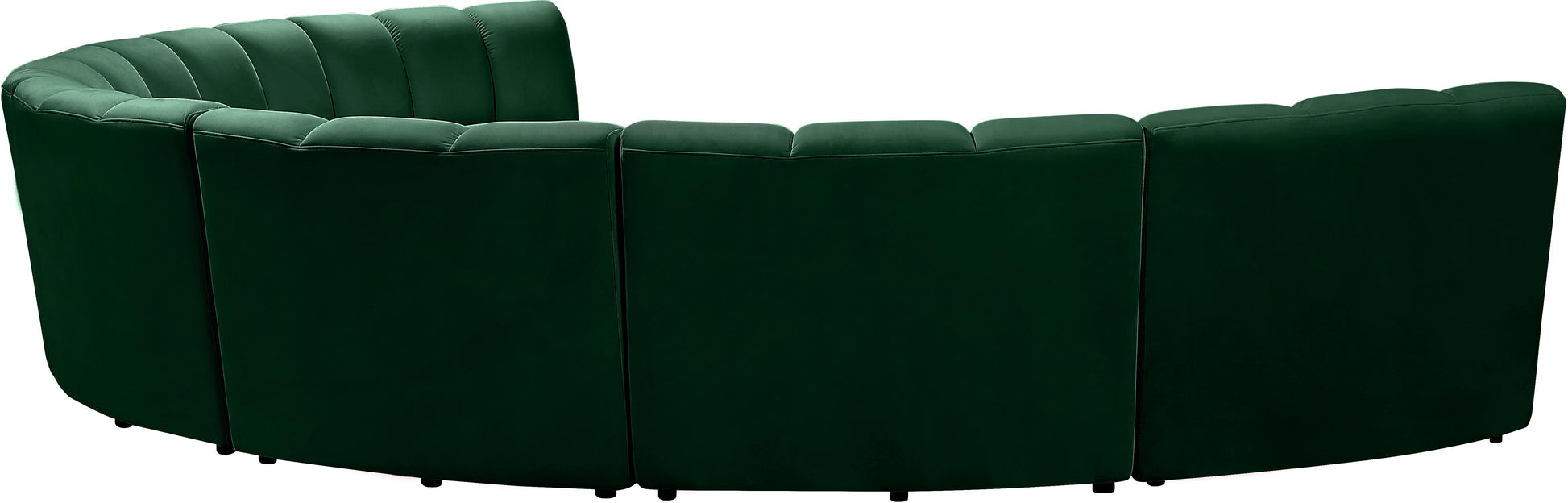 Create a seating group that works for every possible situation with this Infinity modular 7-piece sectional and other pieces in the Infinity collection. Upholstered in soft green velvet material that feels great against the skin and offers long-wearing beauty, this piece fits with other Infinity items for an infinite number of combinations that get your seating requirements just right but that look just as nice when used on their own.