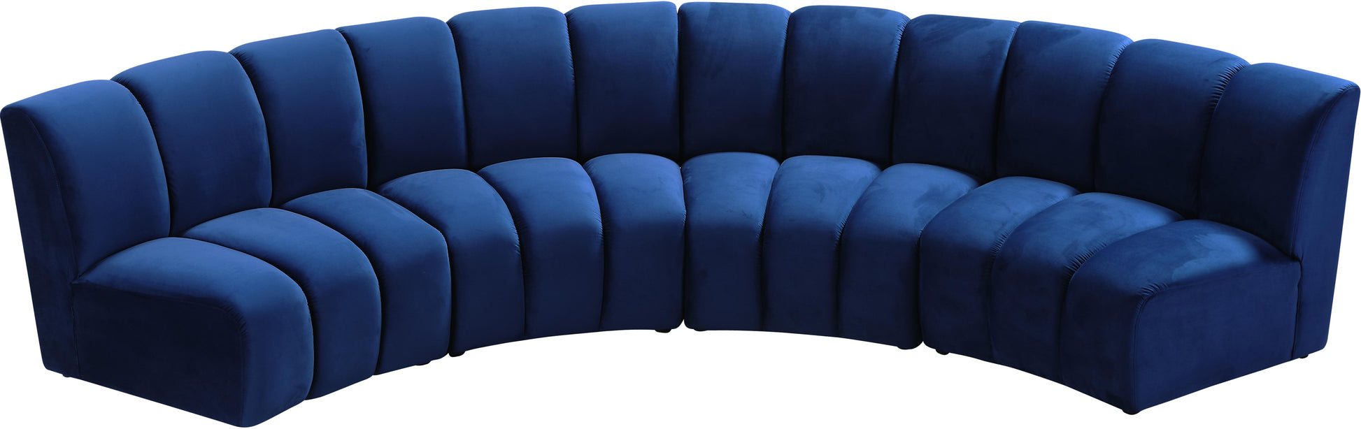 Create a seating group that works for every possible situation with this Infinity modular 4-piece sectional and other pieces in the Infinity collection. Upholstered in soft navy velvet material that feels great against the skin and offers long-wearing beauty, this piece fits with other Infinity items for an infinite number of combinations that get your seating requirements just right but that look just as nice when used on their own.