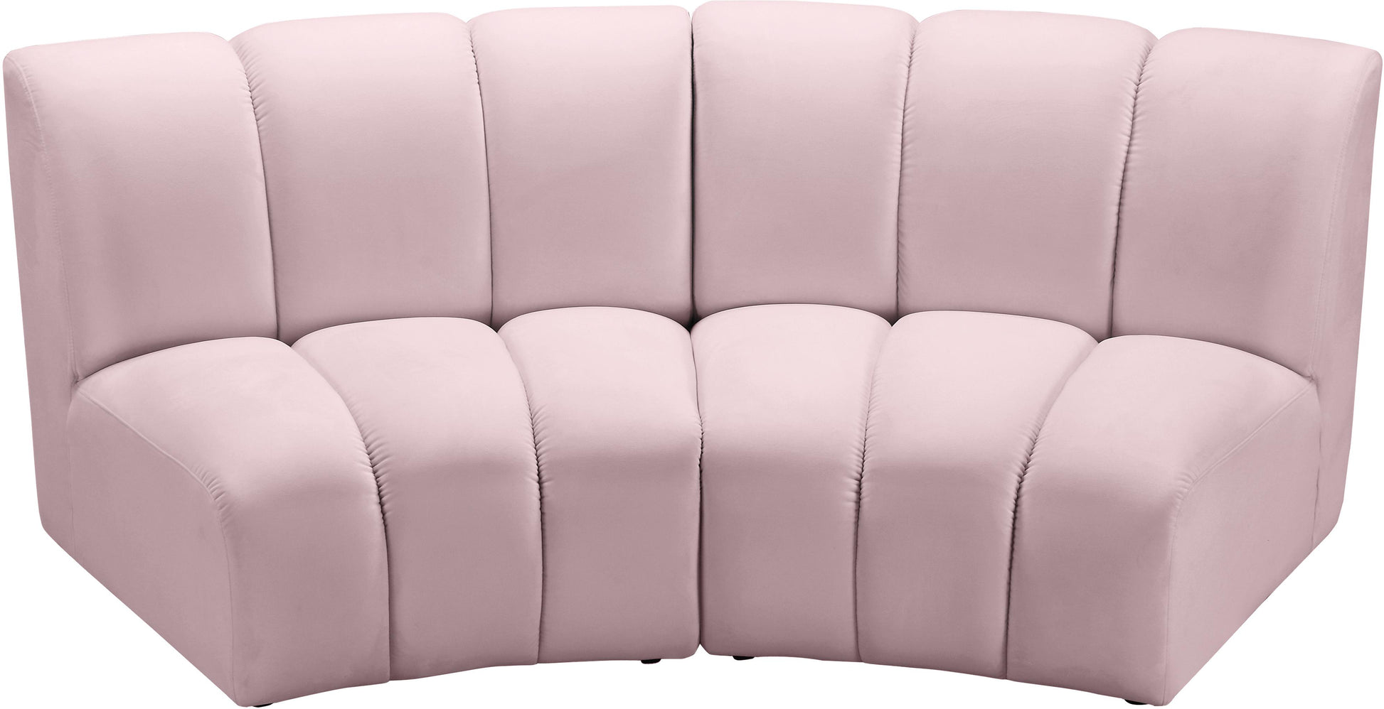 Create a seating group that works for every possible situation with this Infinity modular love seat and other pieces in the Infinity collection. Upholstered in soft pink velvet material that feels great against the skin and offers long-wearing beauty, this piece fits with other Infinity items for an infinite number of combinations that get your seating requirements just right but that look just as nice when used on their own.