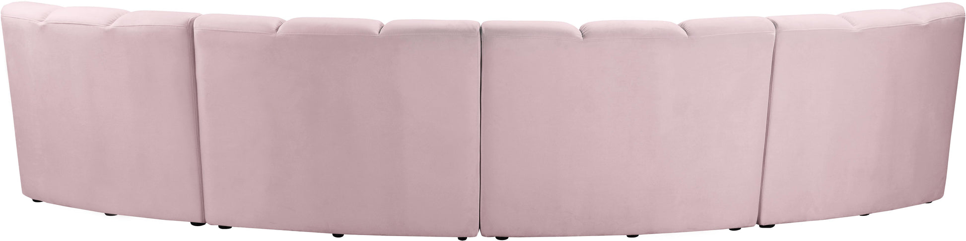 Create a seating group that works for every possible situation with this Infinity modular 4-piece sectional and other pieces in the Infinity collection. Upholstered in soft pink velvet material that feels great against the skin and offers long-wearing beauty, this piece fits with other Infinity items for an infinite number of combinations that get your seating requirements just right but that look just as nice when used on their own.