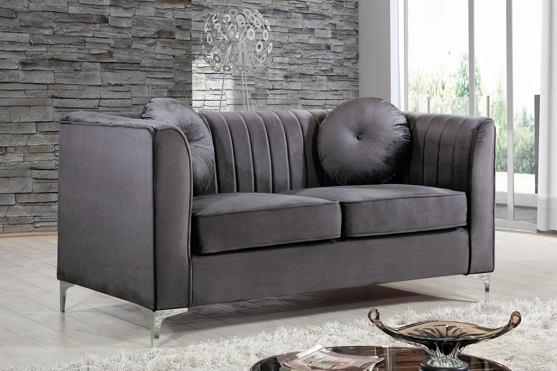 The Isabelle Collection by Meridian Furniture. Features beautifully designed velvet upholstery with custom chrome legs. This collection is guaranteed to be the highlight of any home. Throw pillows included.