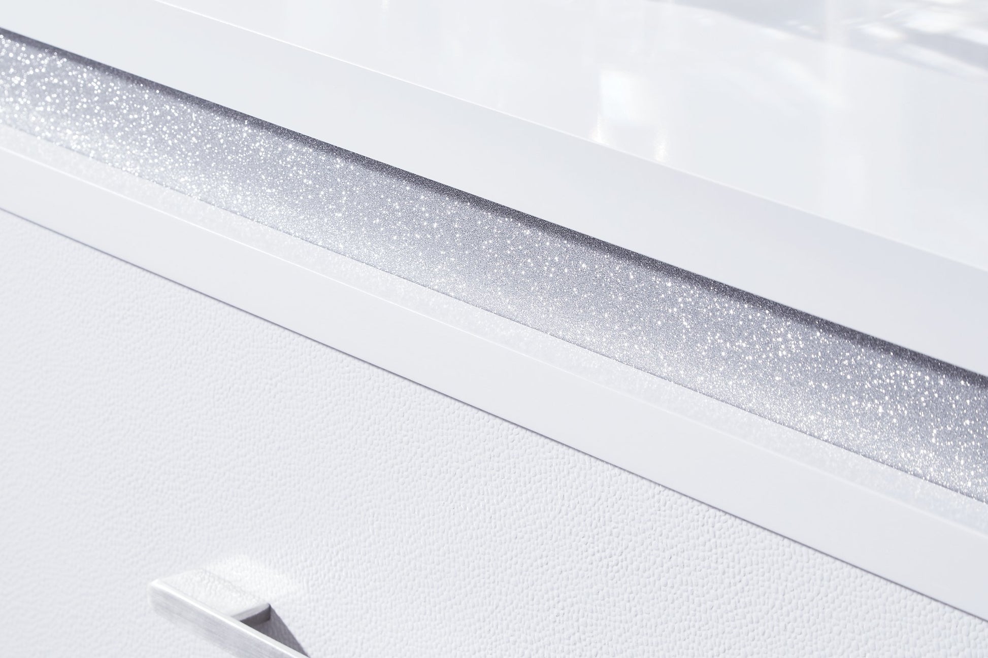 This dresser with mirror is a showstopper, bringing a touch of modern glamour to your sanctuary. A sleek white finish and inset glitter accents create a luxurious feel, while six spacious drawers provide ample storage for your wardrobe. The mirror’s built-in LED lighting adds a soft glow, making it even easier to get ready in the morning or wind down at night. It’s a simply stunning way to achieve the bedroom of your dreams.More About This Product
