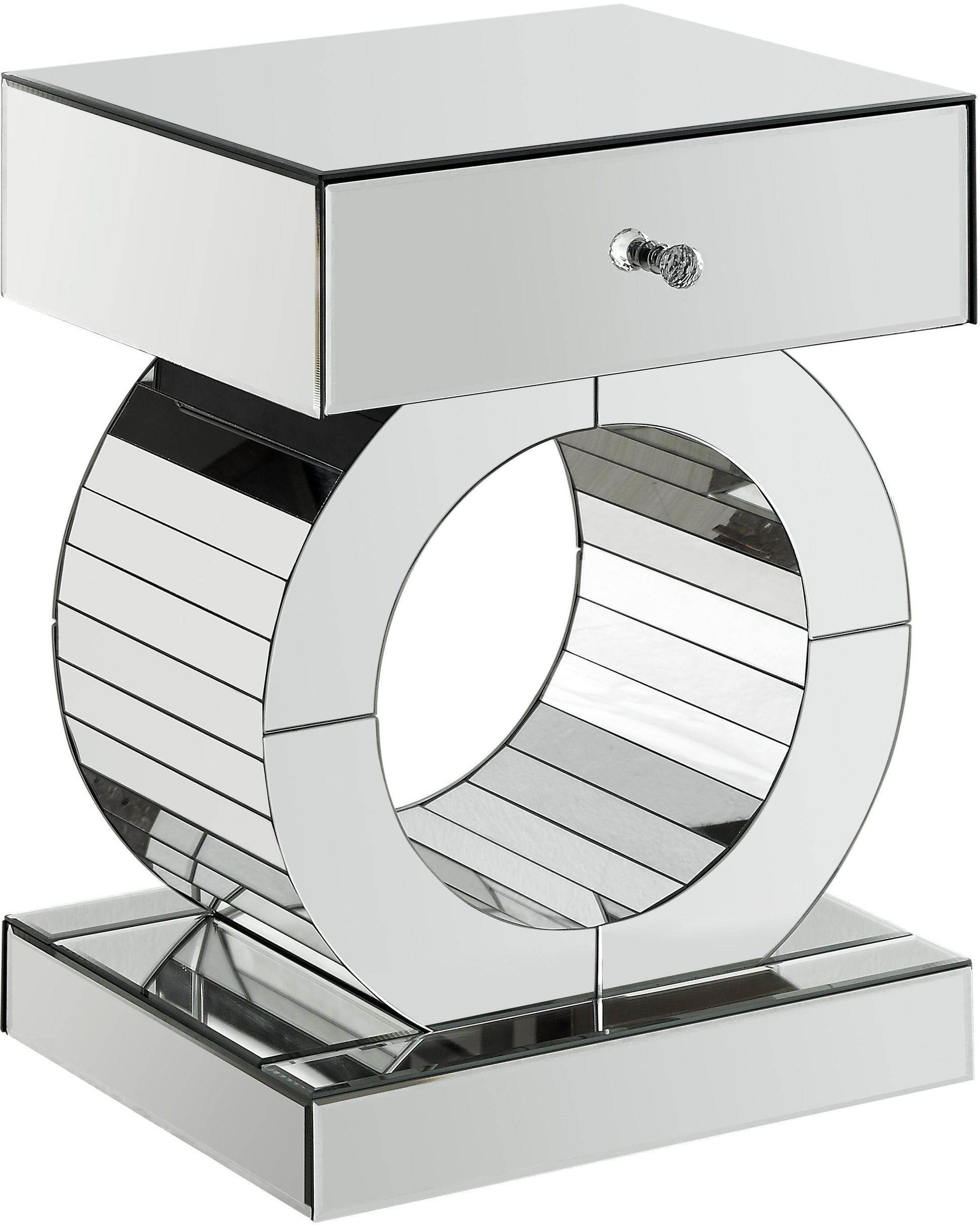 Make this Joceyln end table the center of attention in your living room. This handsome table features a bold design with a geometric footprint that's sleek, chic, and modern. The surface areas of the table are covered in mirrored accents and crystal acrylics, adding depth and dimension to your room while upping the piece's wow factor. The large surface area gives you room for displaying books or other collectibles. Pair it with other items in the Jocelyn collection for a coordinated, modish finish.