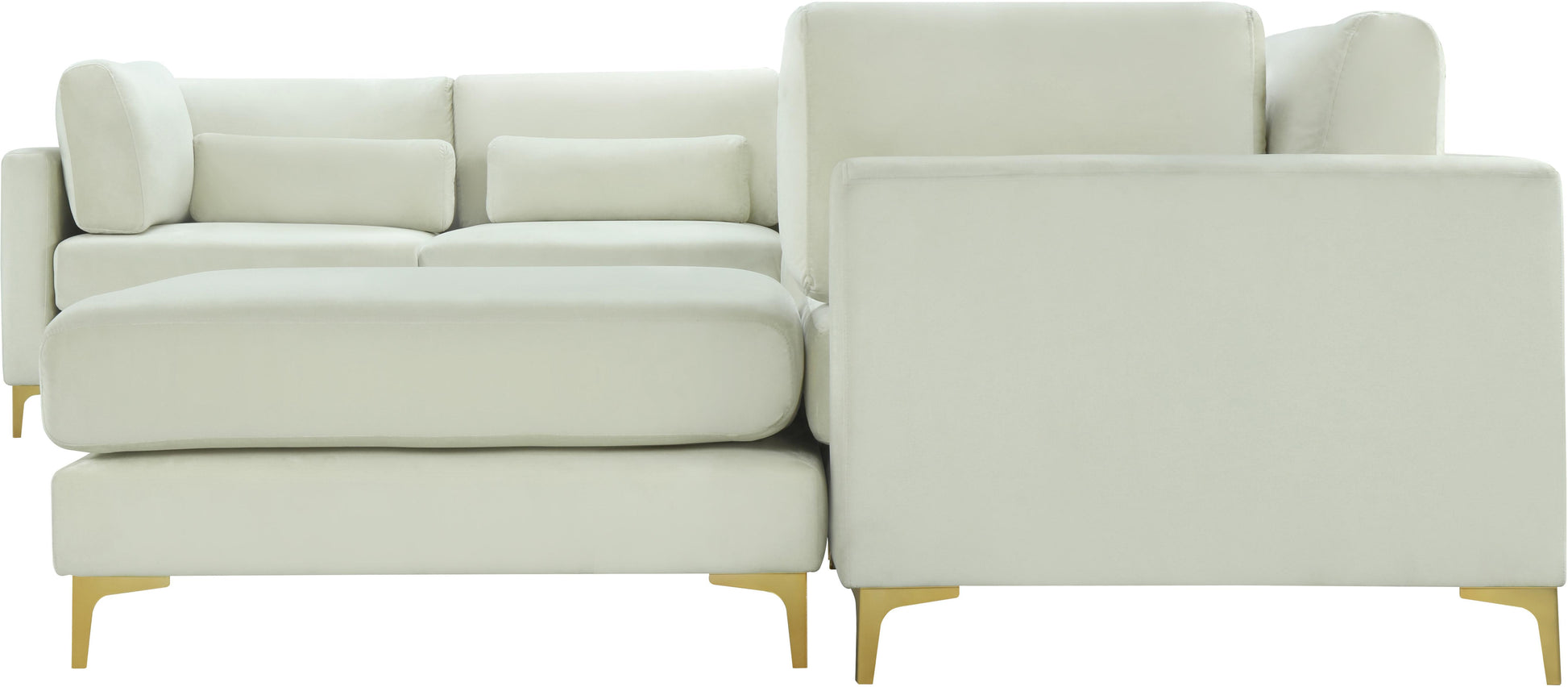 Ready to get cozy? Curl up from the welcoming confines of this Julia velvet modular sectional and you can do just that! Its soft cream velvet upholstery is soft and supple to the skin, coaxing you to relax, unwind, and sit for a spell. It comes with both gold and chrome legs for a customizable and contemporary finish. Pair this Julia piece with others to form an infinite number of seating configurations to meet your particular decorative desires and space requirements.