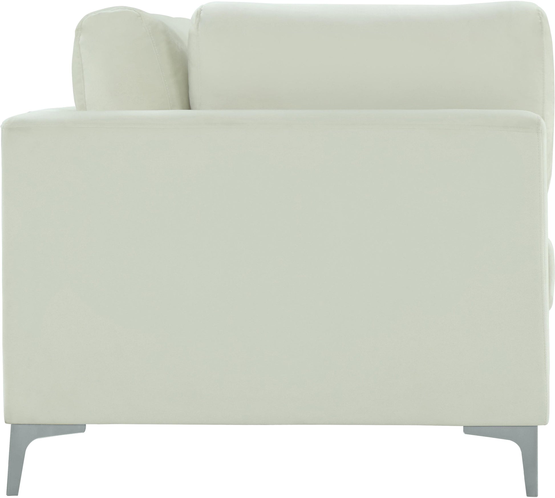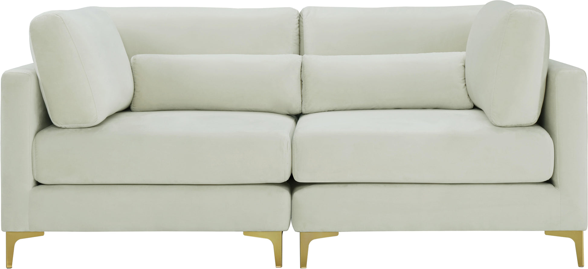 Ready to get cozy? Curl up from the welcoming confines of this Julia velvet modular sofa and you can do just that! Its soft cream velvet upholstery is soft and supple to the skin, coaxing you to relax, unwind, and sit for a spell. It comes with both gold and chrome legs for a customizable and contemporary finish. Pair this Julia piece with others to form an infinite number of seating configurations to meet your particular decorative desires and space requirements.