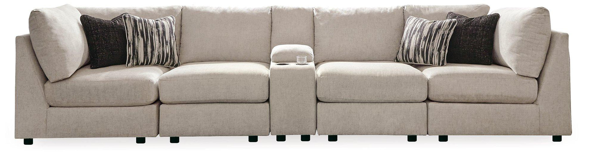 With its casual-contemporary aesthetic and modular design, the Kellway sectional makes way for high style and indulgent comfort. Rest assured, the thickly cushioned storage console includes not only a pair of cup holders, but also a USB port to keep you powered up while you unplug. Wedge-cut armrests are right on point for those who fancy a clean, modern look. Plush-to-the-touch chenille-feel upholstery in bisque beige is pure delight.More About This Product